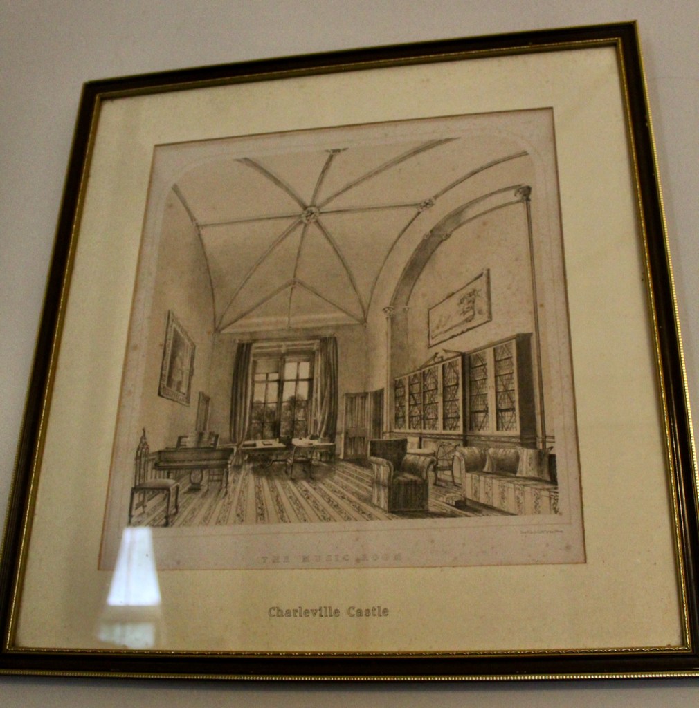 “…it was time to look more closely at the collection of Charleville drawings which had been auctioned in the 1980s. Many of these are in the Irish architectural Archive, and those that were not bought were photographed. Here I found two pages of designs for windows that were signed by Catherine (‘CMC’: Catherine Maria Charleville). There is a sketch of a door annotated in her hand writing. There is a drawing showing a section through the castle depicting the wall decoration and furniture that had been attributed to Catherine. Rolf Loeber had a perspective drawing of the castle which showed the building, not quite as it was built, in a clearing in a wood. The architecture was quite confidently drawn and the trees were excellent. It was labelled ‘Countess Charleville’. I looked again at some of the sketches of early ideas for the castle in the Irish Architectural Archive. In one, the building design was hesitant while the trees were detailed; an architect wouldn’t bother with such good trees for an early design sketch. There was another that had an architect’s stamp; the massing of the building quickly drawn, the surrounding trees extremely shadowy. I could see Catherine and [Francis] Johnston talking about the design in these drawings.” [3]
