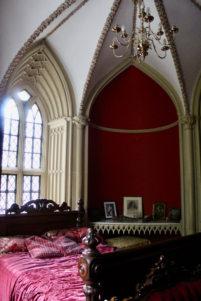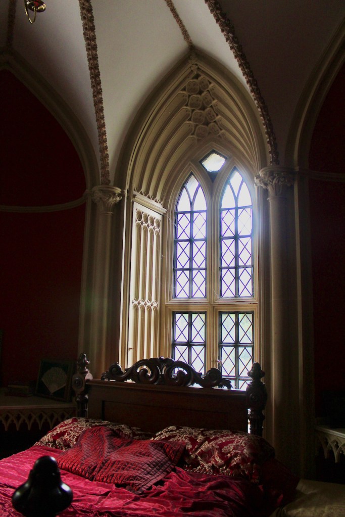 The Music Room connects via a curved short corridor to the Boudoir in the northeast tower, a homage to Walpole’s Tribune in Strawberry Hill, Tierney tells us. This used to be my friend Howard Fox’s bedroom when he was staying as a guest, leading mushroom foraging walks in Charleville Woods! It is a star-vaulted circular room, with bays alternating between four wide round niches and smaller openings for windows, door and fireplace. Above was Lord Charleville’s dressing room, but we did not get to go there.