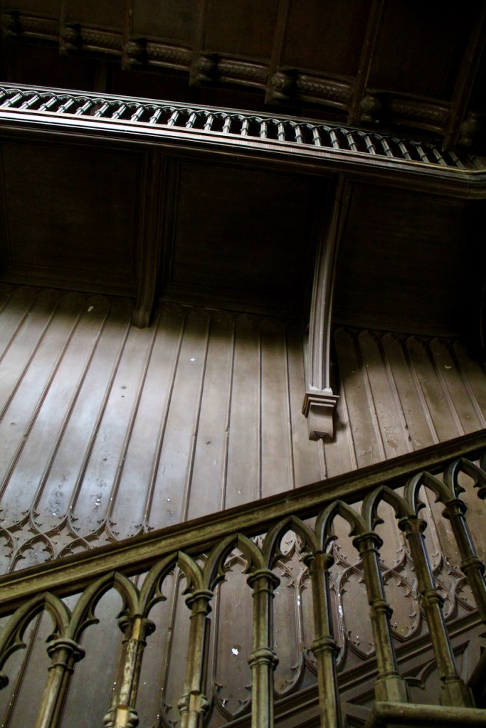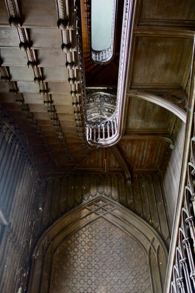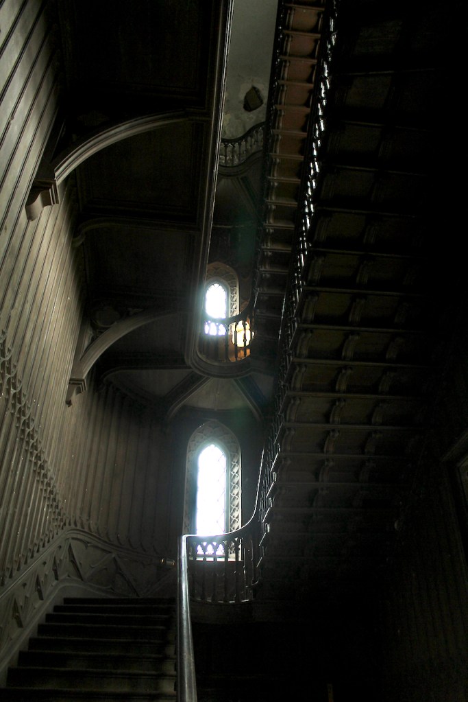 The stairs is tucked away in an odd place, behind a door off the northwest corner of the entrance hall. It is an intricate tightly curved staircase of Gothic joinery leading to the upper storeys, with Gothic mouldings on walls. The wall panelling is plaster painted and grained to look like oak. It rises through three storeys.