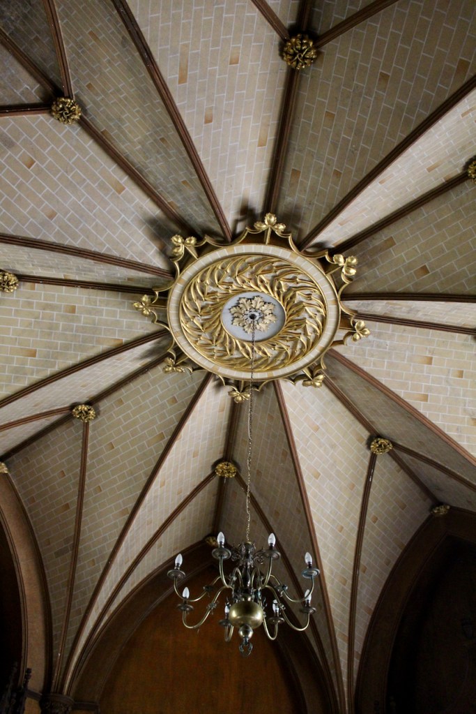 Beyond the staircase on the primary level is a small library with rib vaulted ceiling and Gothic bookcases.