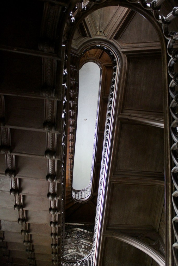 The heavy oak stairs run from the basement to piano nobile. This imitates a similar configuration by James Wyatt at Fonthill and Windsor, which Lord Charleville knew. The upper stage, Tierney describes, has a plaster-panelled dado with ogee-headed niches in the style of Batty Langley, conceived for a parade of suits of armour in drawings by Lady Charleville.