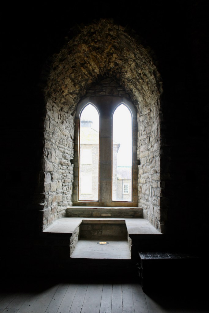 Larger windows were a later addition. Originally there would be only small loopholes. Before glass, the larger windows would be covered with skins to keep out the draught. The inside would have been limewashed, the white walls would then brighten the interior. The fireplace would also provide light.