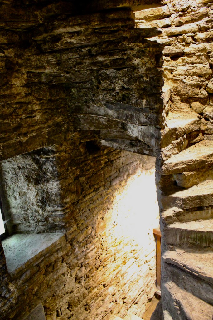 Above the drawbridge is a machicolation from which boiling substances could be dropped, and there are also arrow loop windows for defence. The stairs, called “trip steps” were deliberately built of different heights and widths to impede the intruder. The spiral clockwise to make it more difficult for the enemy to fight his way up the steps.