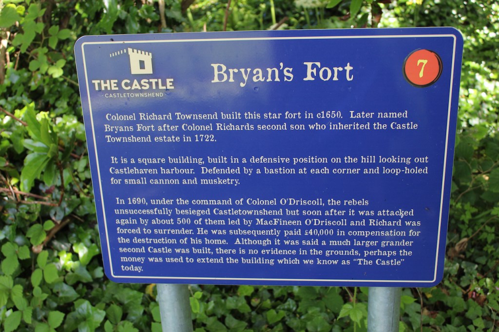 The website tells us: “The building is in fact a 17th century castellated house, not a defensive castle from earlier times. It was built by Colonel Richard Townesend [1618-1692] towards the end of the 17th century, starting off as a much smaller dwelling. The first castle, known as ‘Bryan’s Fort’ [named after his son Bryan (1648-1726)], was attacked and destroyed by the O’Driscolls in 1690, and its ruins remain in The Castle grounds to this day. Richard then built a second castle, which is thought to be where Swift’s Tower still stands.“