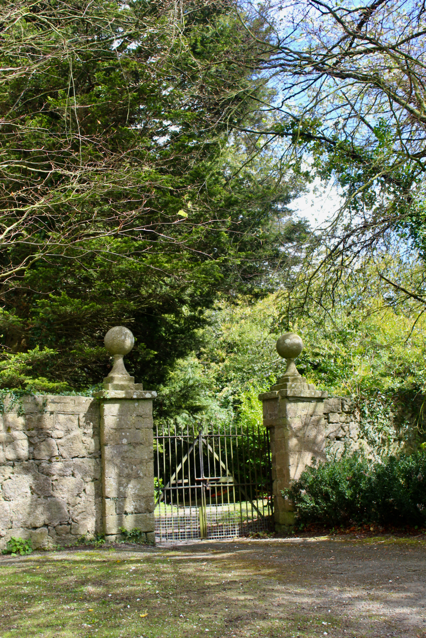 We didn’t walk the route that passes the Temple. Robert O’Byrne tells us that the building was erected by Corona North in 1998, shortly before she died, and is constructed of local granite with six Doric columns supporting a domed roof. The temple is situated at the topmost point of a field to the rear of the house offering eastward views towards the distant Wicklow Mountains.