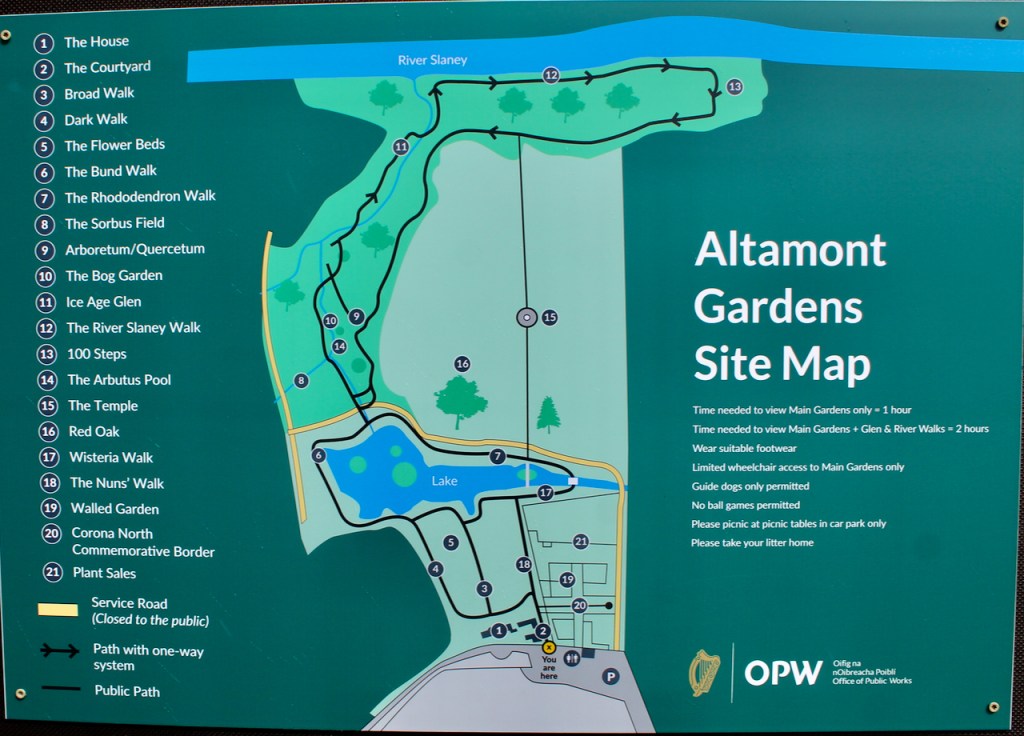The OPW description continues: “For example, there are lawns and sculpted yews that slope down to a lake ringed by rare trees and rhododendrons. A fascinating walk through the Arboretum, Bog Garden and Ice Age Glen, sheltered by ancient oaks and flanked by huge stone outcrops, leads to the banks of the River Slaney. Visit in summer to experience the glorious perfume of roses and herbaceous plants in the air.