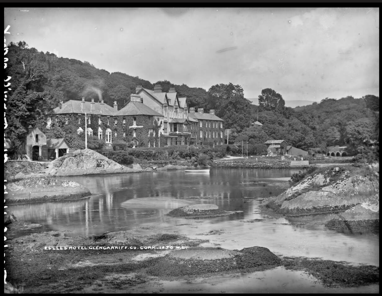p. 290. “(Petty-Fitzmaurice, Lansdowne, M/PB) A two storey house of mid C19 appearance; pillared porch between two three sided bows, the front being prolonged on one side by a similar bow, and on the other by a lower service wing ending in a gable. Orignally a shooting box of the Marquesses of Lansdowne (see Derreen); acquired by the Graves family who made a noteable garden here and added an extra storey to the house ca 1950 when they turned it into a hotel. After a serious fire 1984, the house was rebuilt without the additional storey, regaining its original C19 character.”