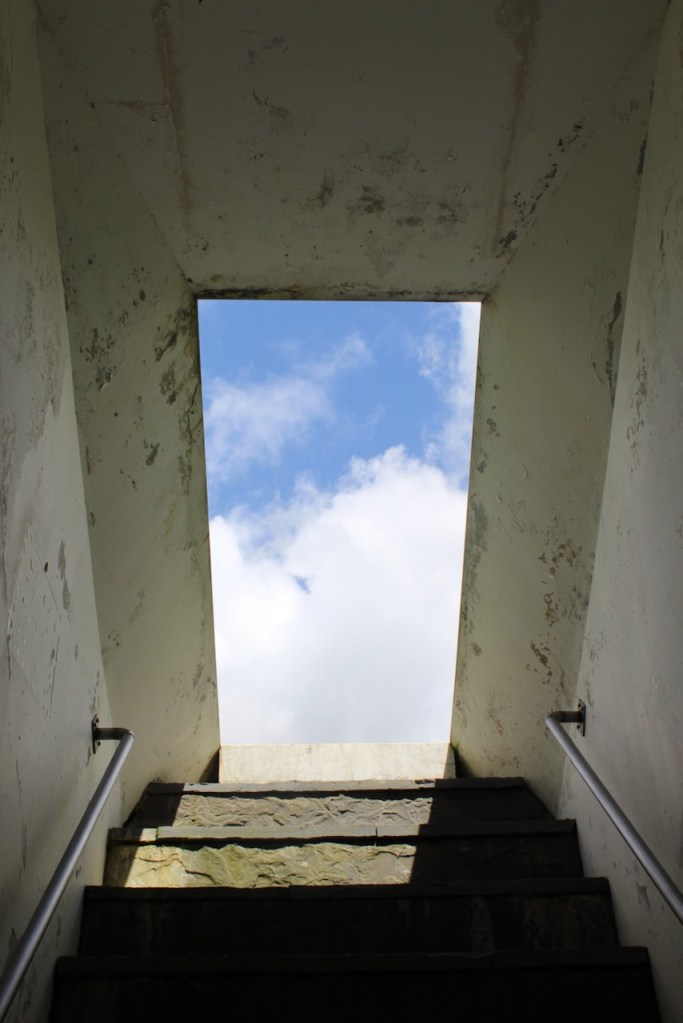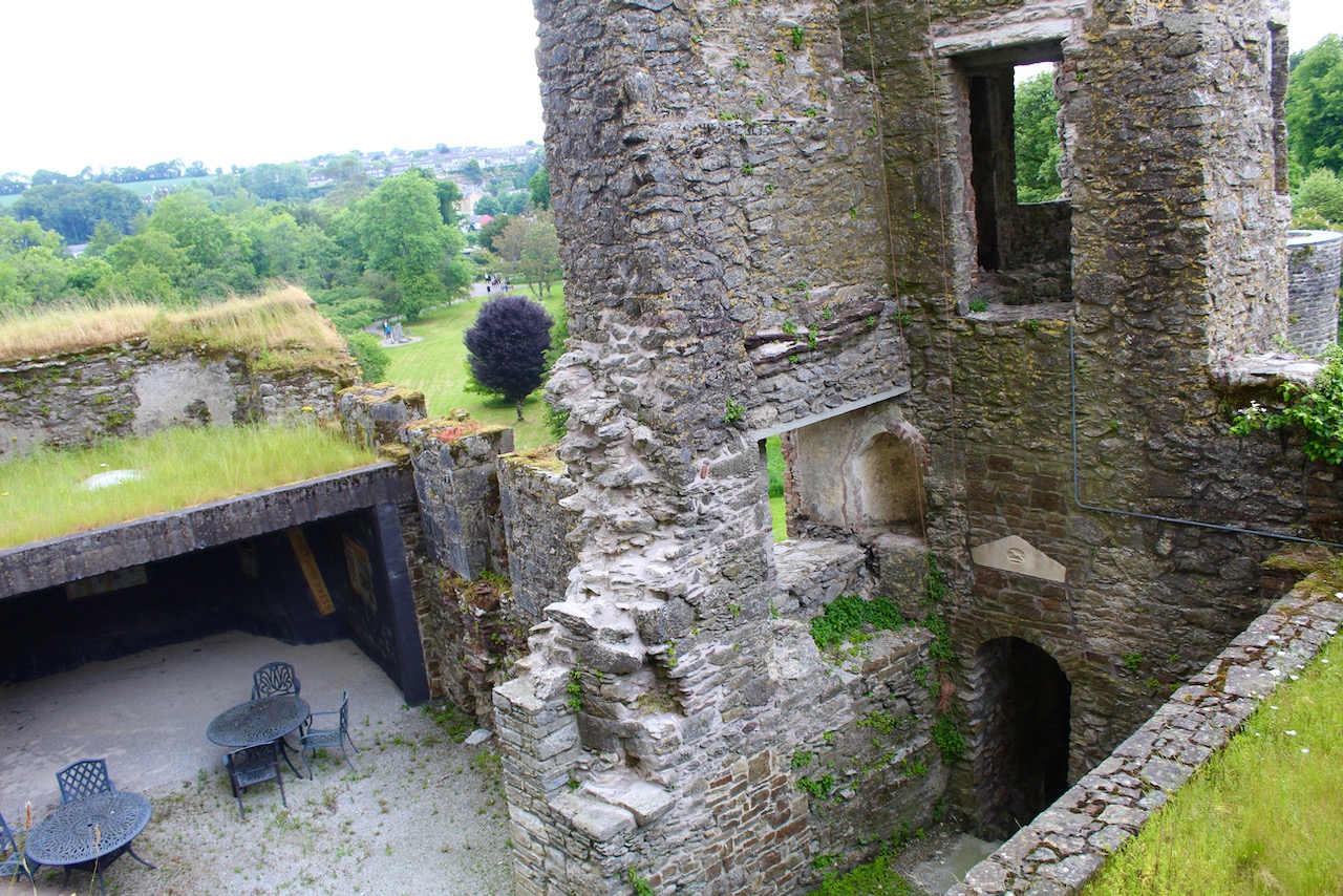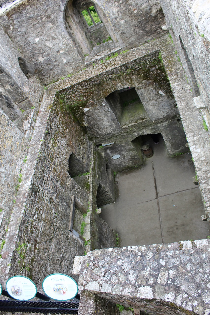 The floors of the banqueting hall, above the family room, and the chapel which would have been on the floor above the banqueting hall, are gone, so when you reach the top of the castle, you can look down inside.