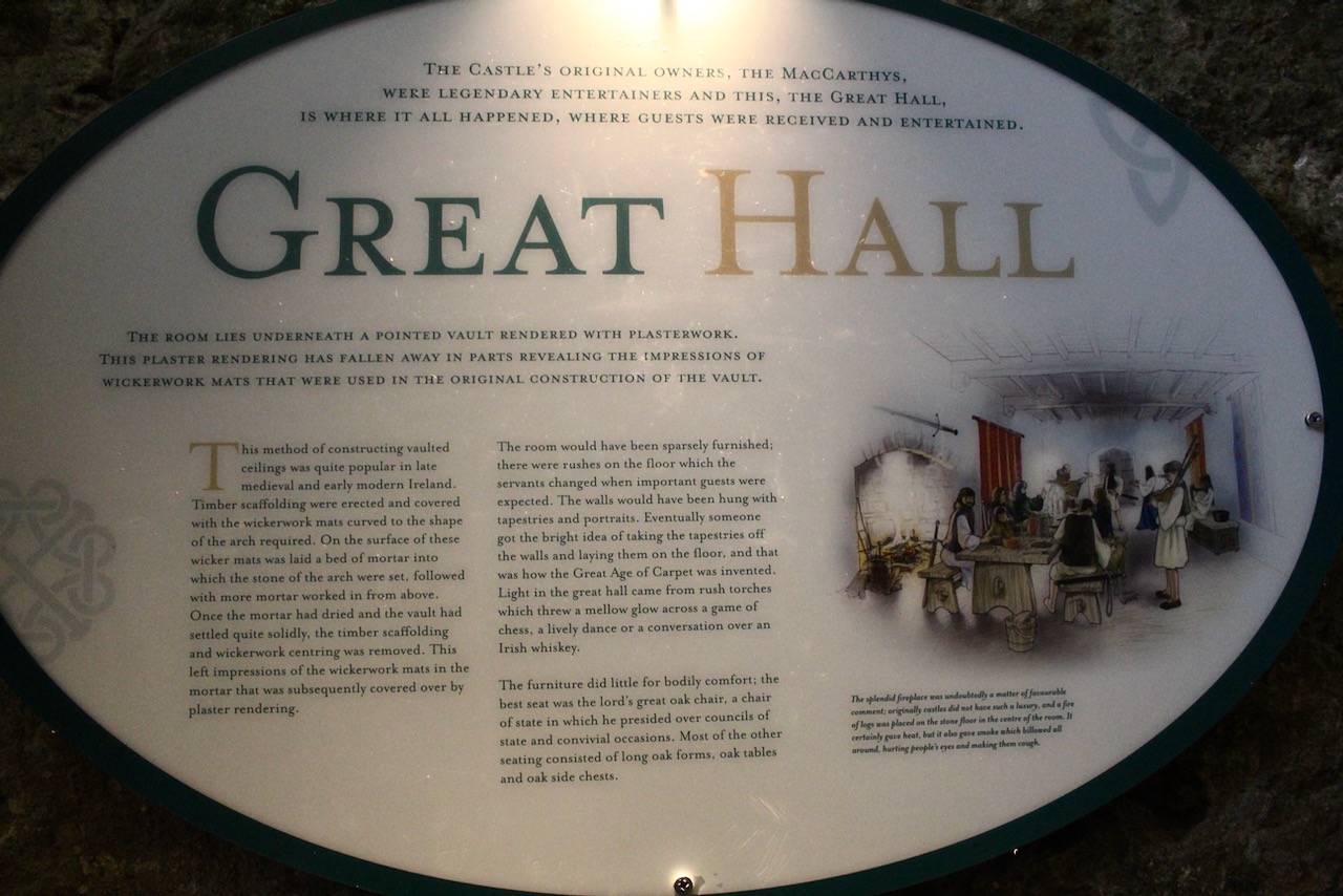 The information boards tell us that feasting was part of the way of life at the time and a meal was combined with a night’s entertainment as part of the social life of the Castle. A series of courses would be served, with fish eggs, fowl and roast meat, all highly spiced to keep them fresh. Alcohol served included mead, beer, wine and whiskey. The high ranks sat near the Lord at the top of the table “above the salt” and others sat “below the salt.” As the meal progressed the Chieftain’s Bard would play his harp and sing songs celebrating the prowess of the MacCarthy clan.