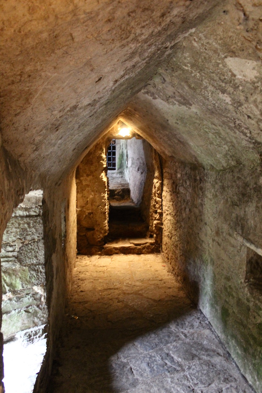 Blarney was a typical tower house with four or five storeys, with one or two main chambers and some smaller rooms on each floor. A vaulted stone ceiling served to keep the thin tower structurally sound by tying the walls together and also acted as a firebreak. Blarney was constructed as two towers, one built later (by about 100 years) than the other. At the bottom the walls are about 18 feet thick. When it was first built it would have been covered in plaster and whitewashed to protect it from rainy weather.