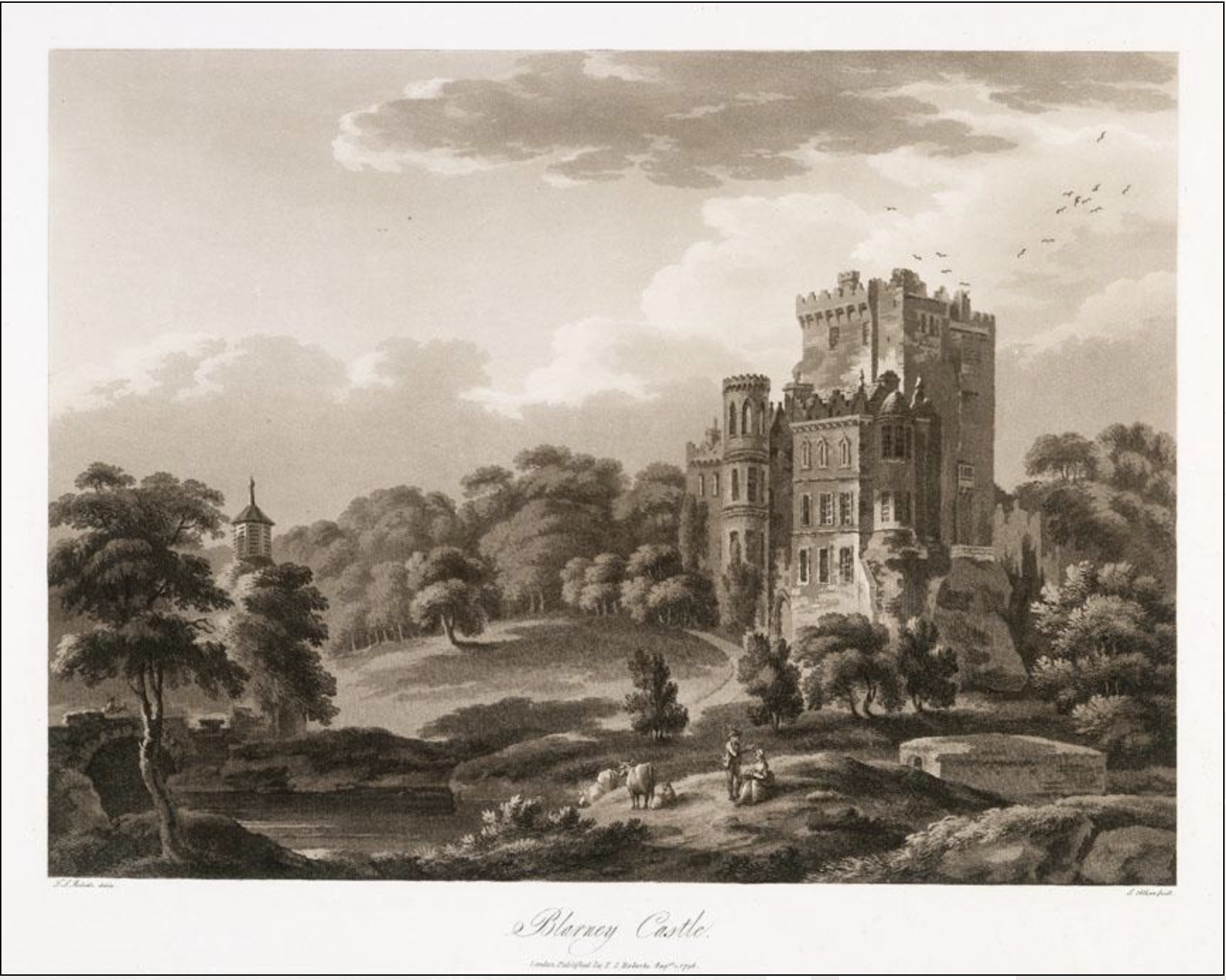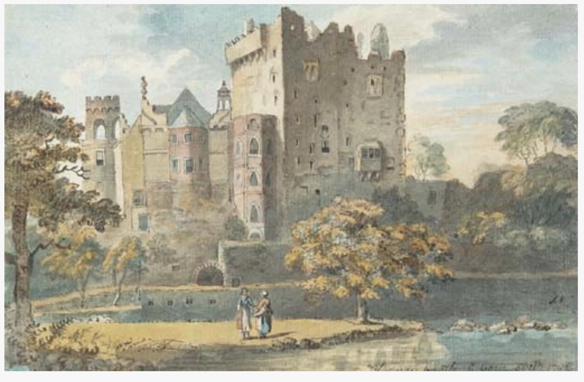 In 1739 James Jeffereyes built a four storey Gothic style mansion on to the side of the castle, which he called “The Court,” demolishing a former house the MacCarthys had added to the castle. Frank Keohane tells us that the architect may have been Christopher Myers, who had previously rebuilt Glenarm Castle in County Antrim. We can see glimpses of its appearance from the round towers and ruins to one side of the castle, which are the remnants of this grand mansion. The Jefferyes family also laid out a landscape garden at Blarney known as Rock Close, with great stones arranged to look as though they had been put there in prehistoric times. There is a stone over the “wishing steps” inscribed “G. Jefferyes 1759” which commemorates the date of birth of James Jefferyes’s heir. It was a popular tourist destination as early as the 1770s.