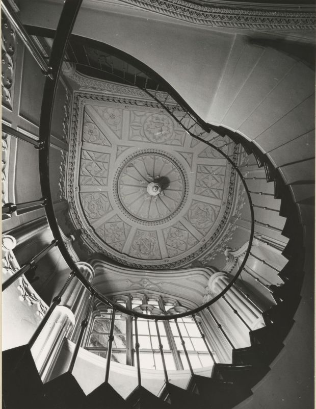 There is a beautiful curved brass-banistered spiral stairway, which is pictured in a book of photographs (simply called Photographs) by Paddy Rossmore, edited by the Irish Aesthete Robert O’Byrne, published this year by Lilliput Press and reviewed in January in the Irish Times. [see 5]