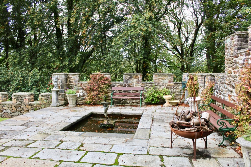 A wall extends from the folly tower, to frame a courtyard on the far side of the wall from the house. On the house side of the wall is a picturesque pond area.