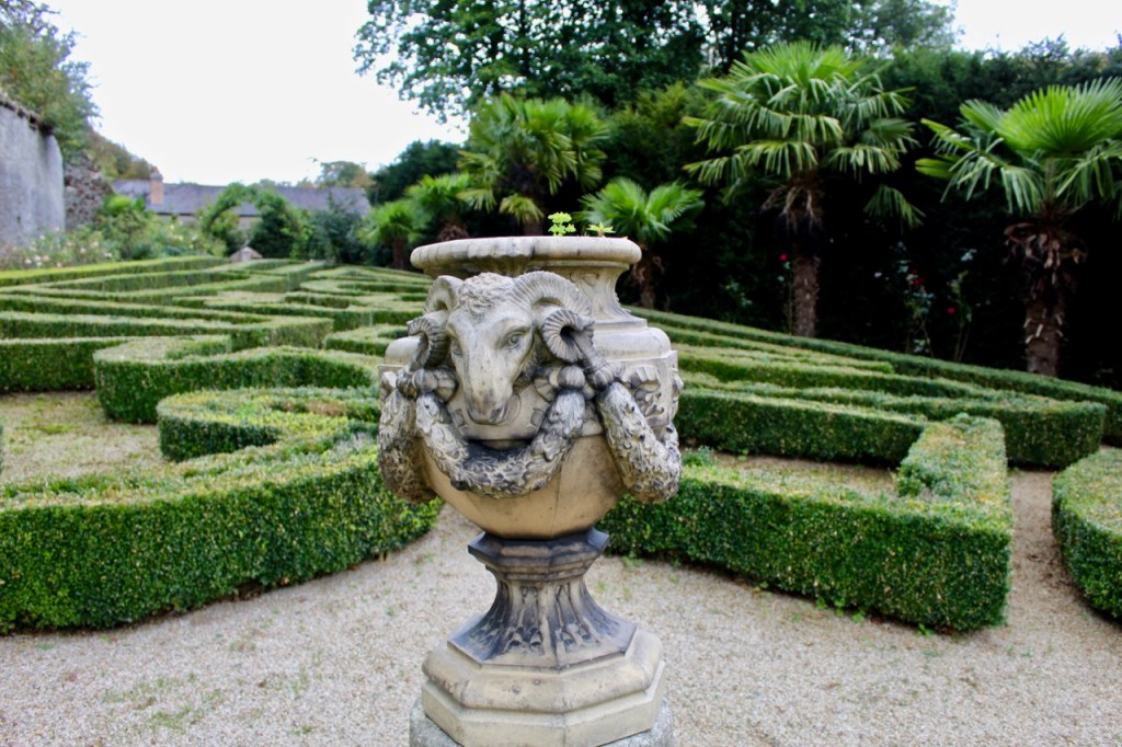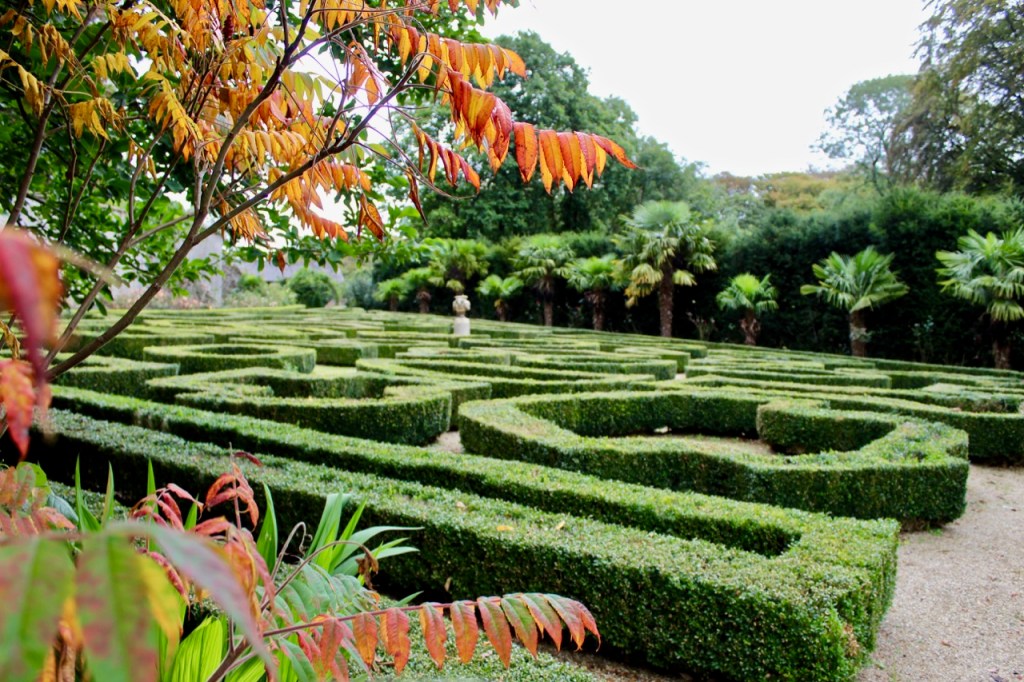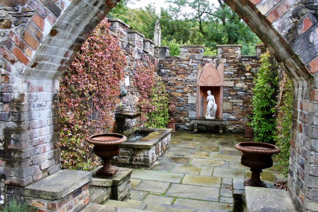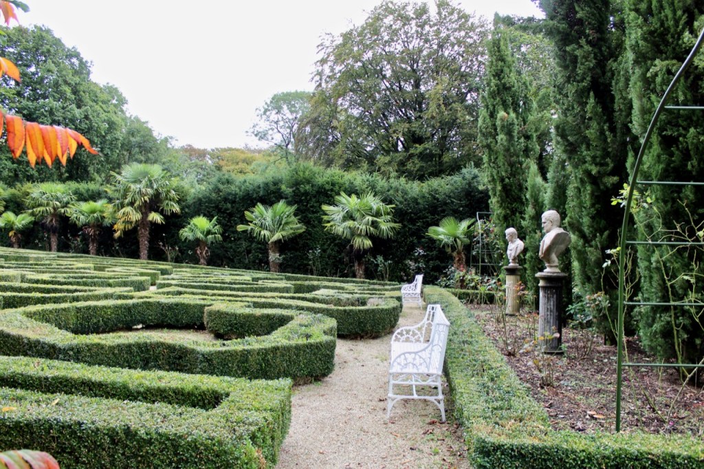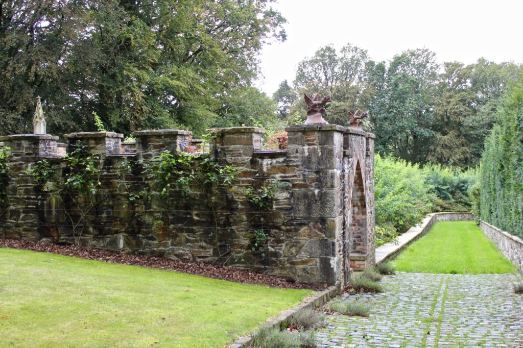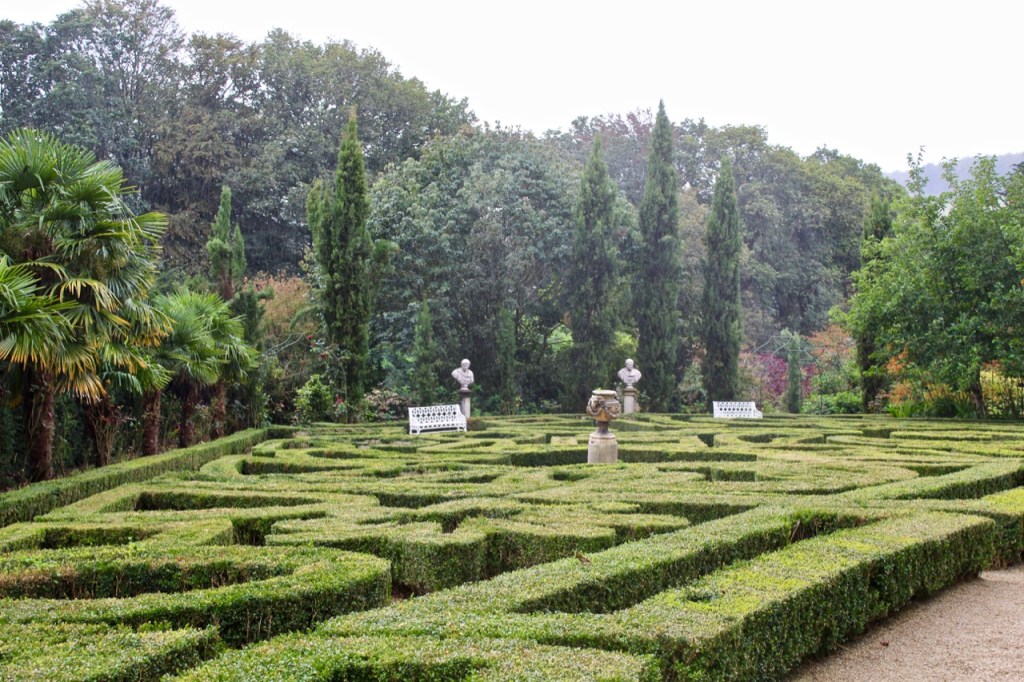 A straight path leads through formal gardens including a maze and an orchard, alongside a tall wall which appeared to lead into woodland and to a walled garden – it was rainy so we didn’t explore as much as I might have liked. At the end of this path are stables and outbuildings. To one side of the path is a clock tower folly and a bricked terraced area and small temple area with a water fountain – it is extremely romantic. The house itself backs onto a large tree filled lawn.
