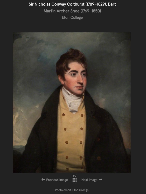 Nicholas Conway Colthurst (1789-1829) 4th Baronet of Ardrum, County Cork, by Martin Arthur Shee, courtesy of Eton College. He was Member of Parliament (M.P.) for the City of Cork between 1812 and 1829. His son the 5th Earl married Louisa Jane Jefferyes, through whom he acquired Blarney Castle.