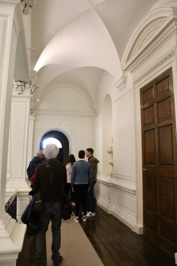 The polished limestone floor with its chequered design and the Kilkenny marble fireplace reflect William Conolly’s desire to build the house solely of native Irish materials. Unfortunately when we visited in October 2022, the hall was half hidden with a large two storey curtain, as the windows are all being repaired. As we can see in the photograph, the room has an Ionic colonnade to the rear, and a gallery at first floor level, and the stair hall is through an archway in the east wall.