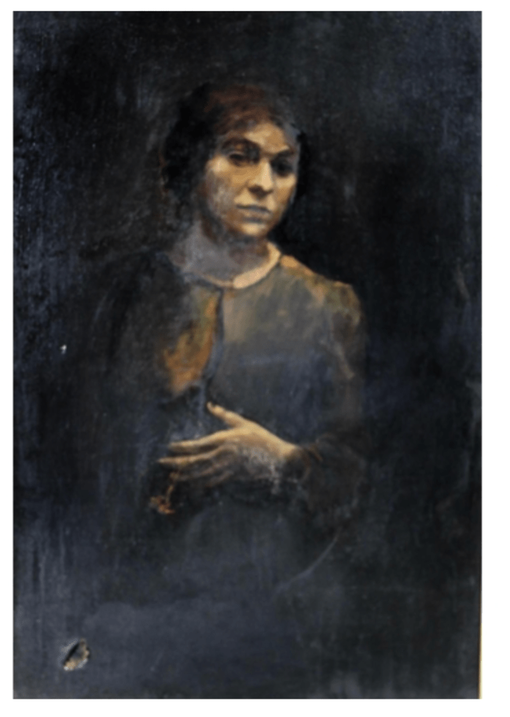 Provenance Originally housed at Castletown Cox, Co. Tipperary. Reputedly the sitter was the lady who put the curse on the Beresford Family of Curraghmore. Courtesy Fonsie Mealy Oct 2018.