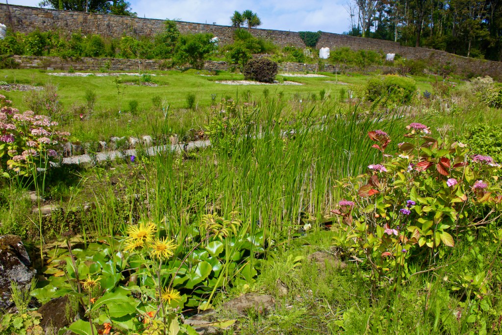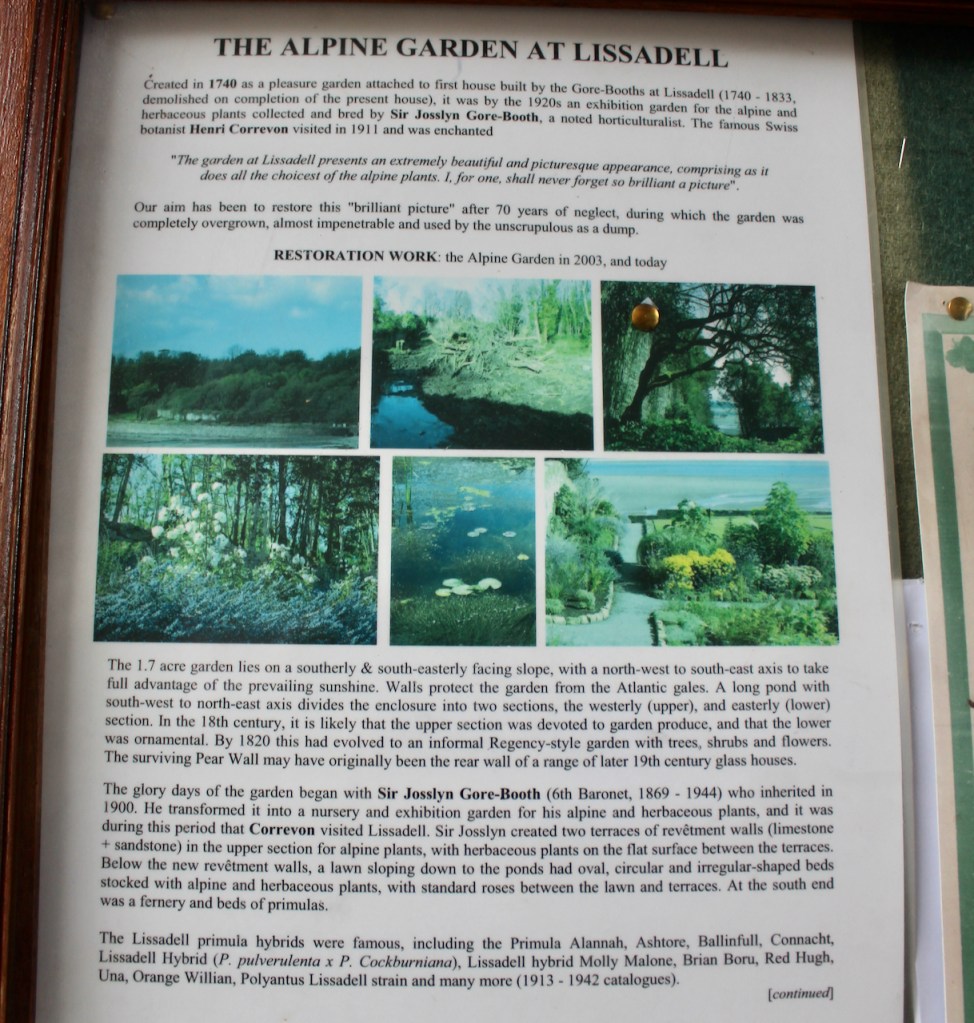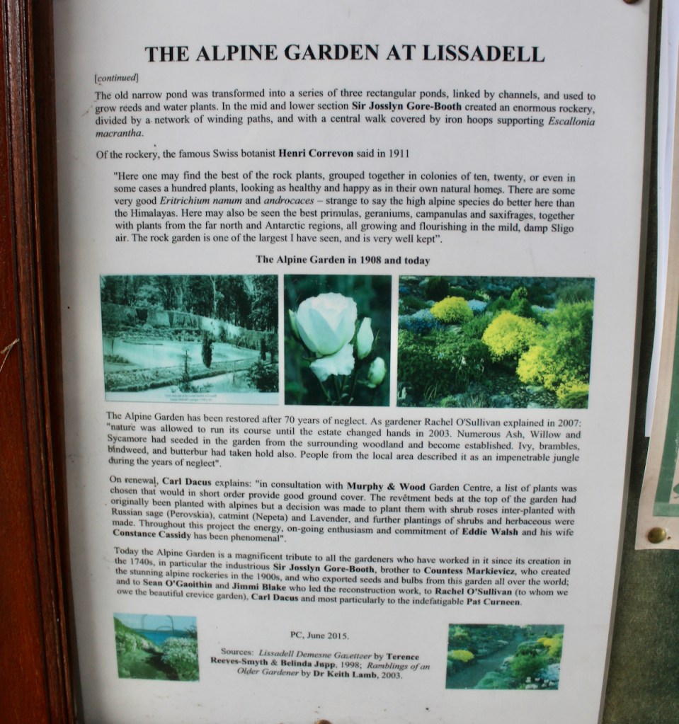 The Image publications book tells us that there has been a great focus on the gardens, with regeneration of the flower and pleasure gardens. The alpine nurseries with its “revetment walls” (limestone and sandstone), terraces, and ornamental ponds had been neglected for half a century. Now the gardens are cleared and the orchards and two-acre kitchen garden have been reseeded. The plan, in many ways, is to resurrect the horticultural enterprise of Henry and Josslyn Gore Booth. Thirty-eight of an original seventy-eight daffodil narcissus cultivars developed by Sir Josslyn are now back in the ground at Lissadell.