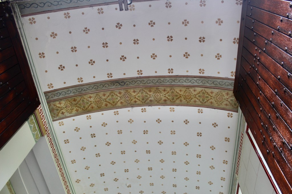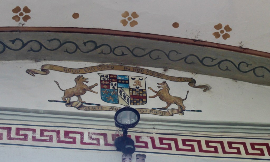 The front door is under the tall porte-cochere, which has a curved painted ceiling and massive wooden doors.