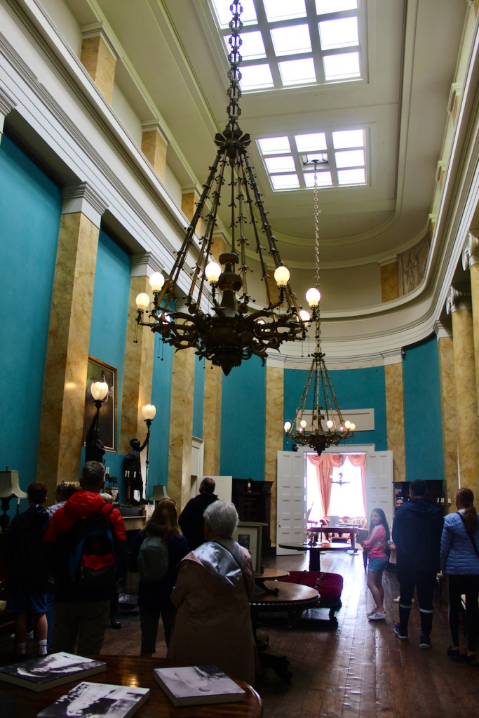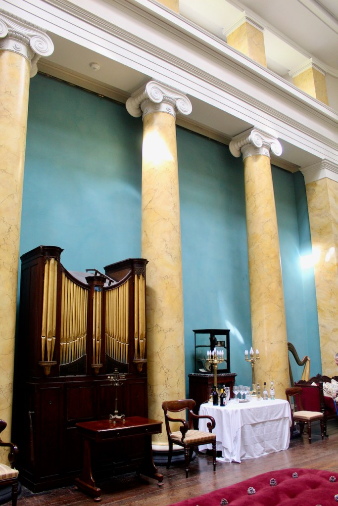 Upstairs is the music gallery. Mark Bence-Jones describes it as a vast apse-ended gallery (an apse is an area with curved walls at the end of a building, usually at the the east end of a church), lit by a clerestory (a clerestory is a high section of wall that contains windows above eye level) and skylights, with engaged Doric piers along one side, and Ionic columns along the other. It was hard to capture in a photograph since we were on a tour.