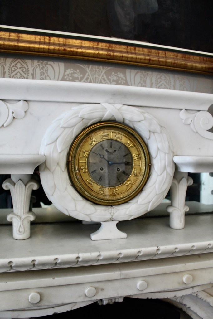 This room, and all other principal receptions rooms, have massive marble chimney-pieces in the Egyptian taste. The ante-room has a striped wallpaper of lovely faded rose.”
