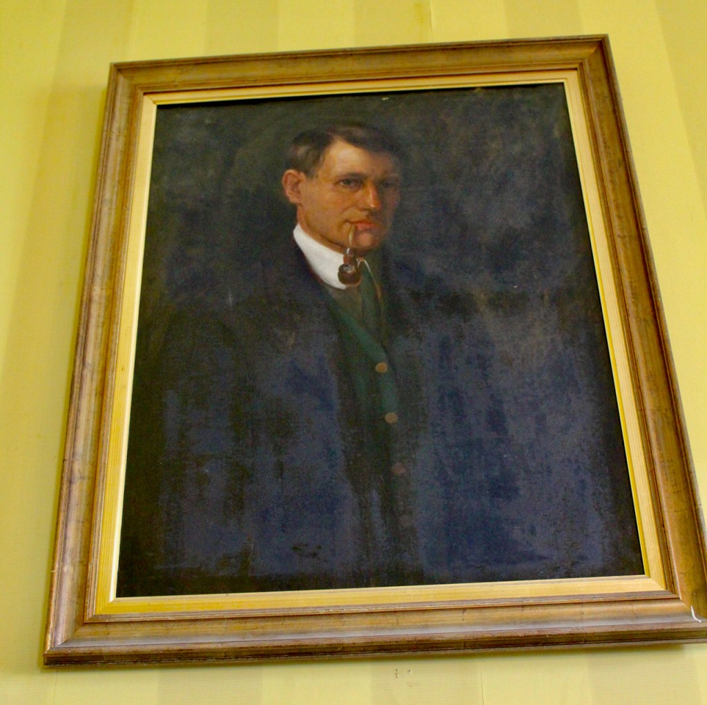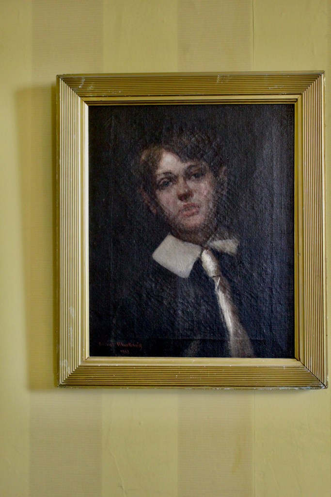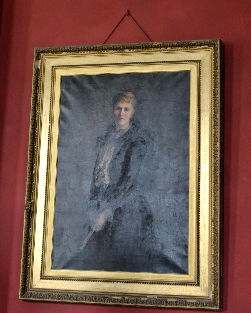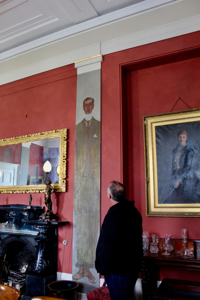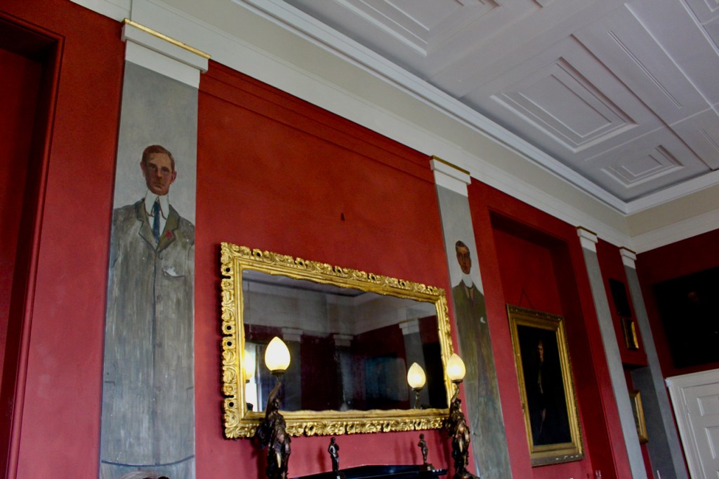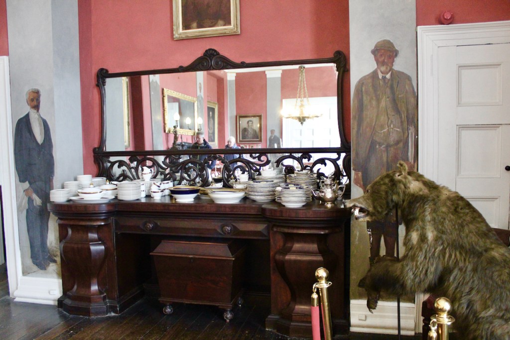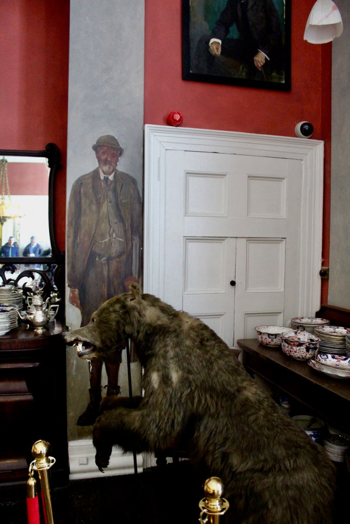 I had been particularly looking forward to seeing the dining room as I had seen pictures of it before and it has rather eccentric paintings which I love! Again, it was hard to take photographs because the room was crowded with the tour. Casimir painted portraits onto the pillars. He painted some of the servants, including Kilgallon. The bear shot by Kilgallon stands now beside his portrait.