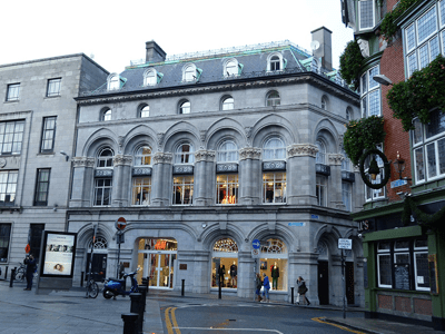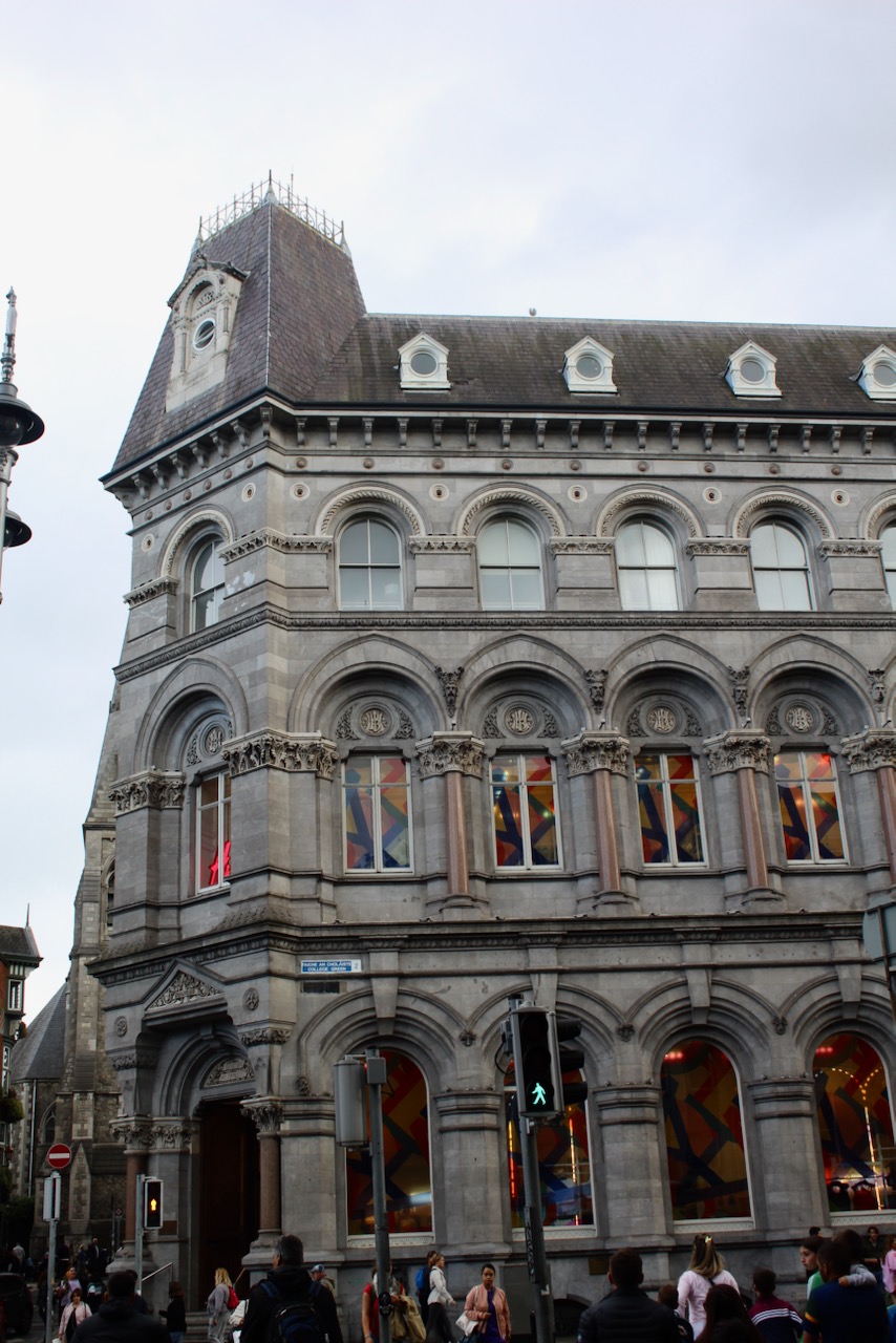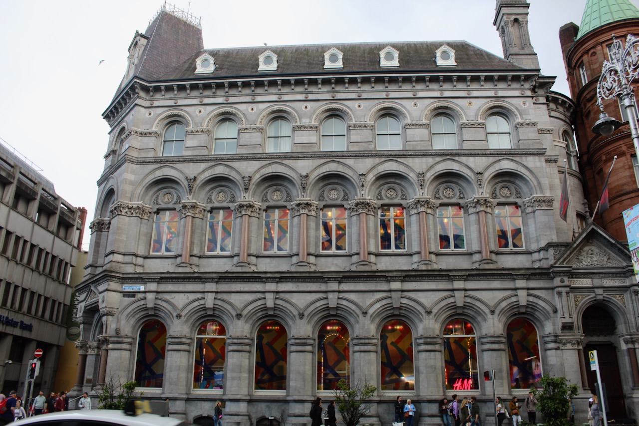 The former Union Bank, latterly the Hibernian Bank, building was designed by William George Murray (1822-1871), in association with Thomas Drew (1838-1910), and construction began in 1864. [1] Originally it was built with just four bays on College Green and two bays on Church Street.