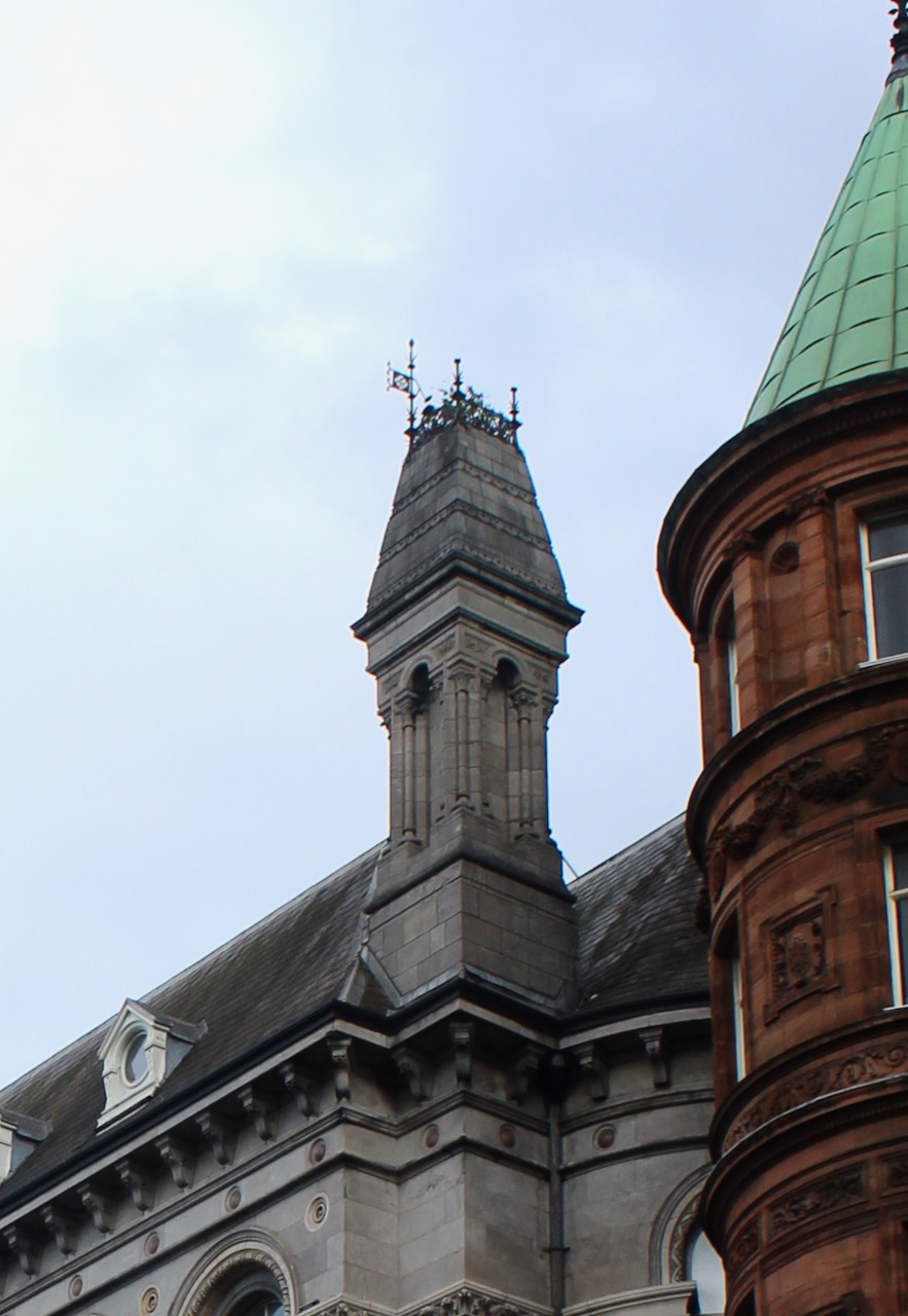 The building features a wonderful “chateau-esque” tower topped with ornate wrought iron railings and finials. It has another tapering belltower-type turret at the other side which is actually a chimneystack.