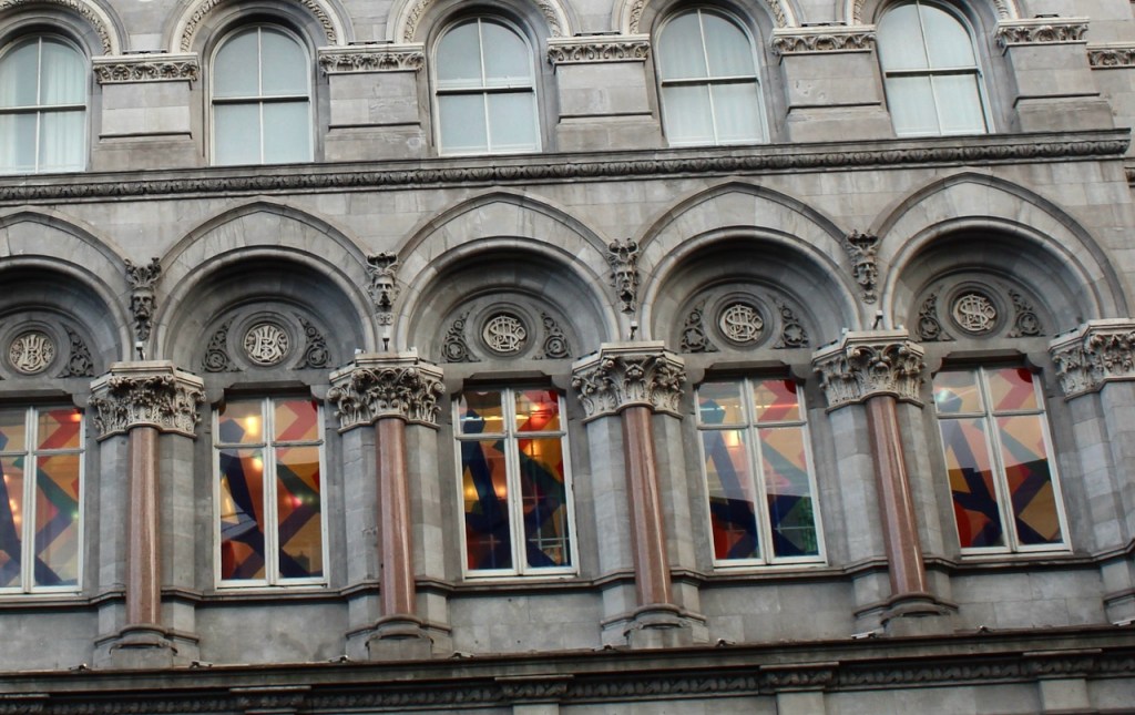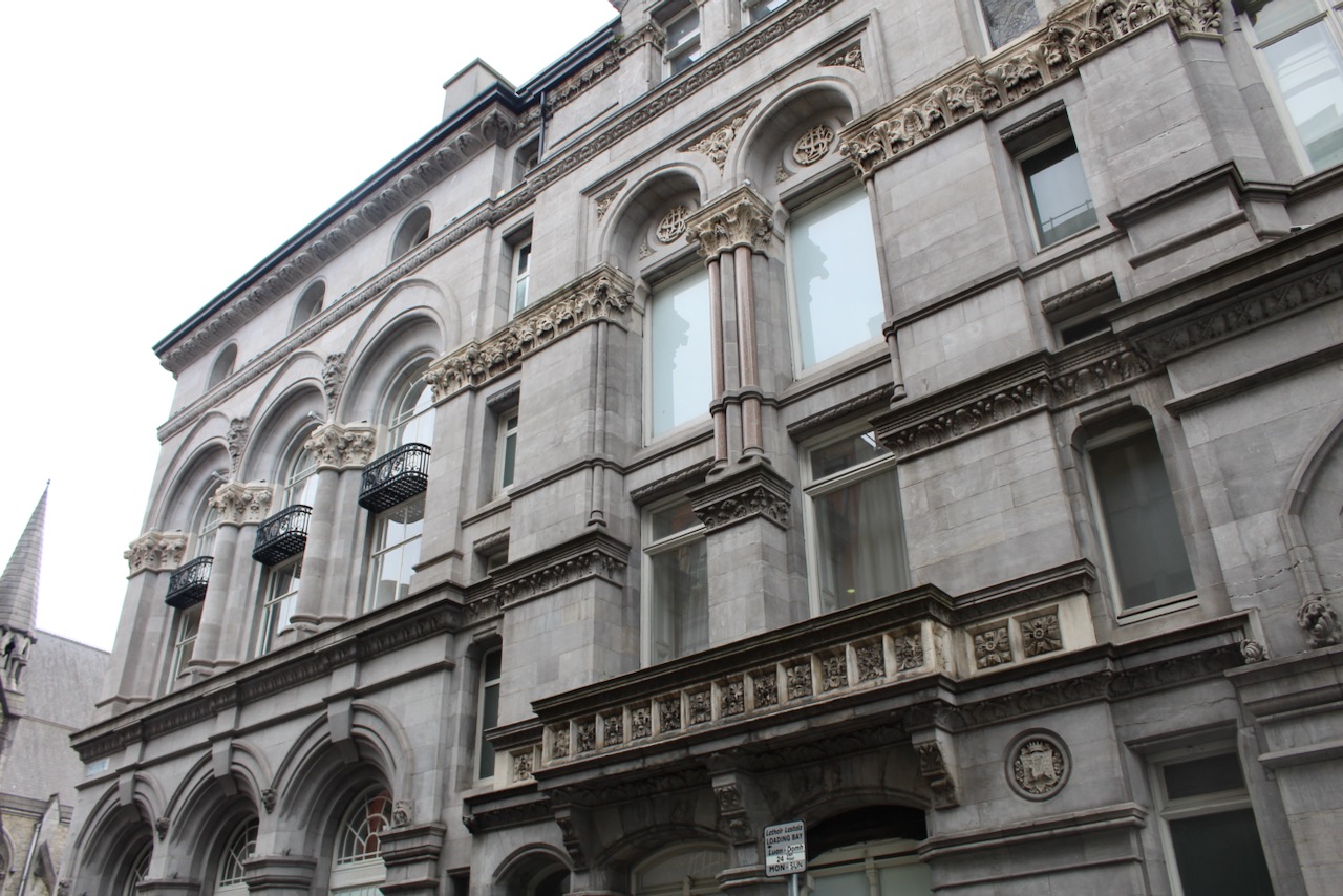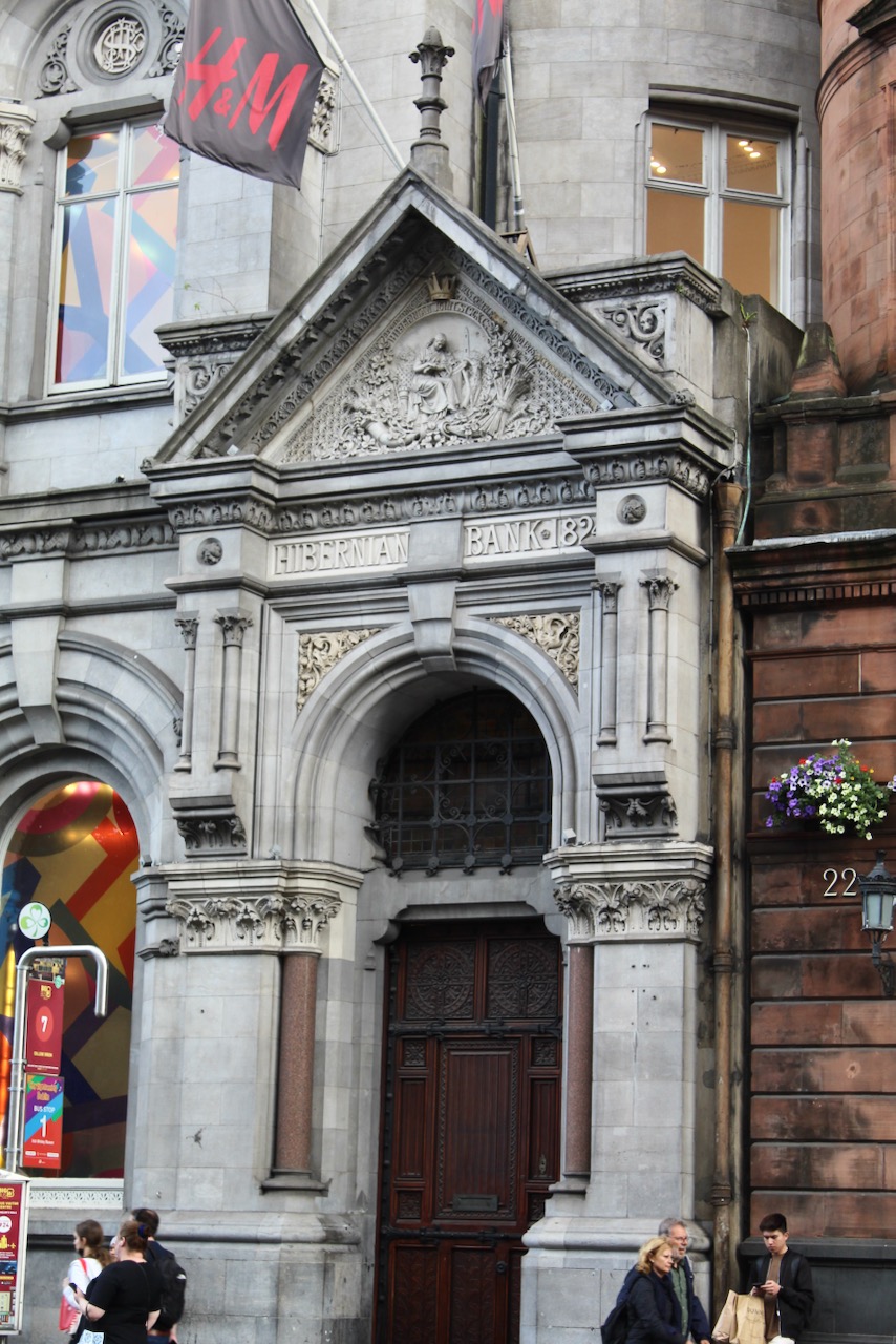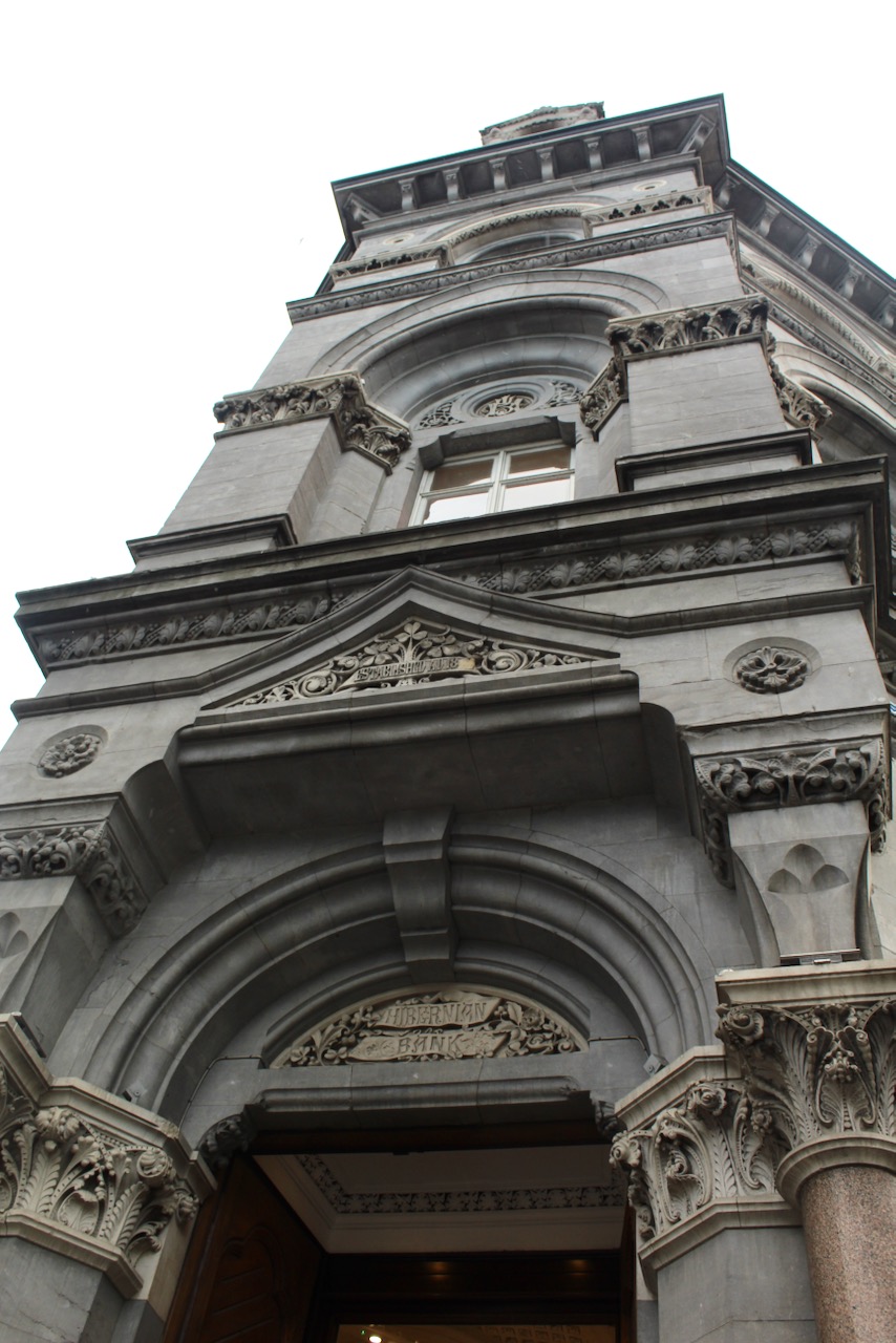 The first floor has more deep semicircular arches divided by columns of polished red granite topped with ornately sculpted capitals. The windows in the first floor are square headed. On the arcading on the first floor level the arches over the windows contain the initials of the banks – the older bays have the initials of the Union Bank and the newer bays, the Hibernian Bank. The windows of the first storey have slightly pointed arched hood mouldings with carved limestone masks to the stops.