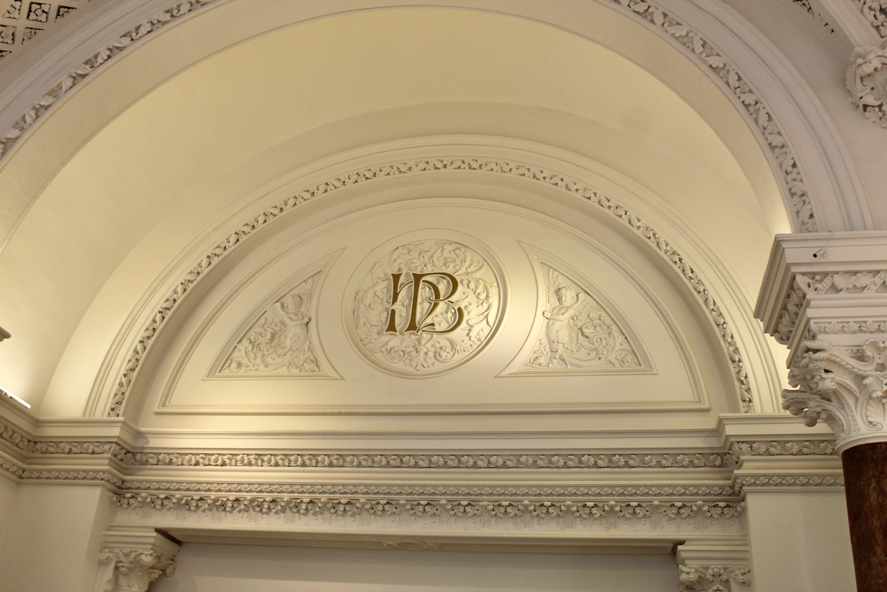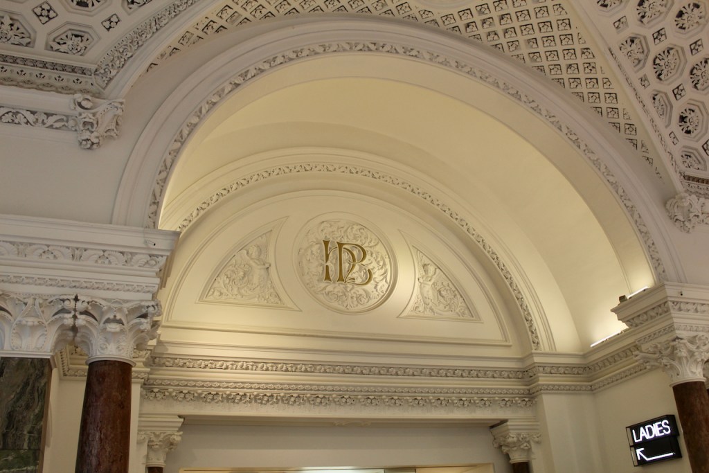 The interior has a vaulted ceiling, which was traditionally left lit up at night for display. It has a semicircular recess on one side. The arched ceiling is very ornate. Archiseek describes it as “arched and groined, and springs from a stone cornice all around; it is covered with coffered panels arranged in a kind of diaper, with rich centre flowers in each.” Note that a “groin” is described by Alistair Rowan in his Buildings of Ireland: Northwest Ulster, as a sharp edge at the meeting of two cells of a cross-vault, and coffering, he tells us, are sunken panels, square or polygonal, decorating a ceiling, vault or arch [see my entry of architectural definitions, https://irishhistorichouses.com/2020/04/18/architectural-definitions/ ]