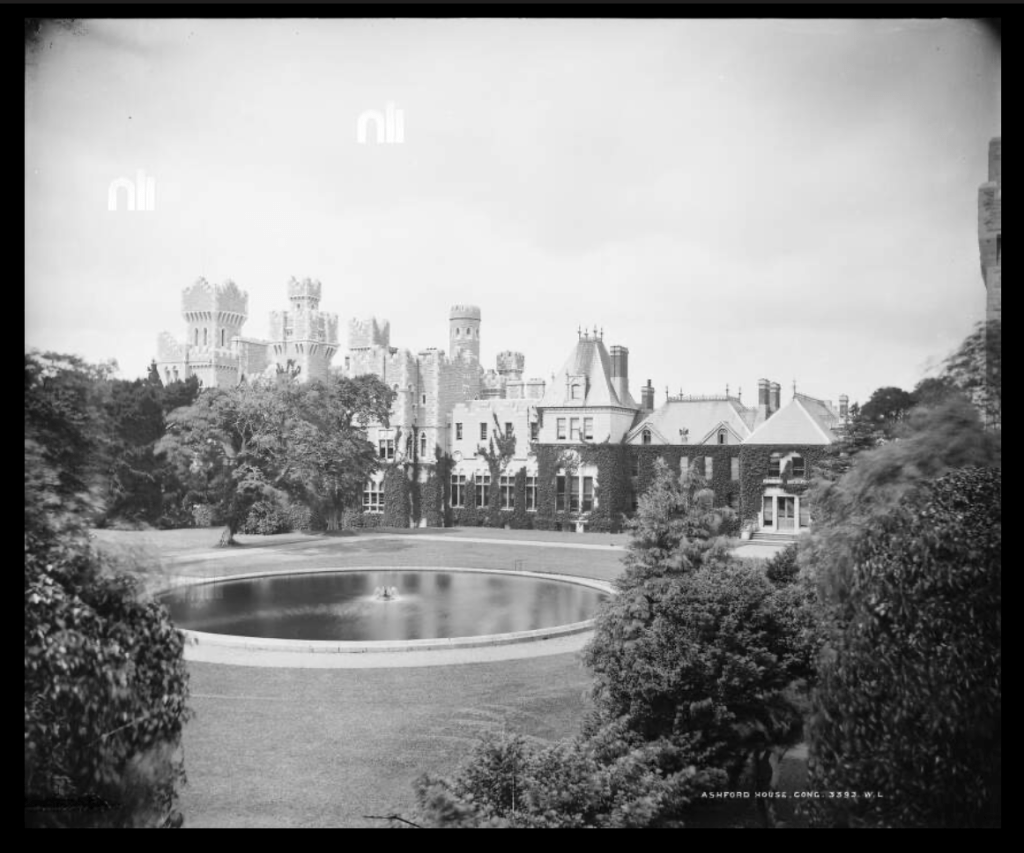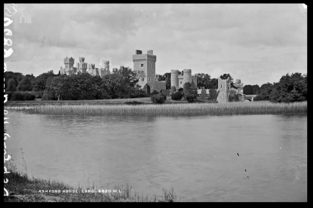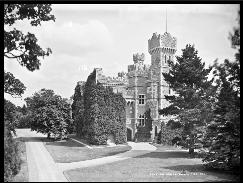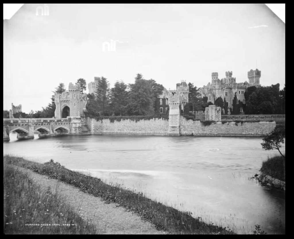 p. 12. “(Browne, Oranmore and Browne, B/PB; Guinness, Bt/PB) A vast and imposing Victorian-Baronial castle of rather harsh rough-hewn grey stone in a superb postion and the head of Lough Corrib…built onto an earlier house consisting of a 2 storey 5 bay Georgian shooting-box enlarged and remodelled in French chateau style. The shooting-box and estate originally belonged to the Oranmore and Browne family; they were sold by the Encumbered Estates Court in 1855 and bought by Benjamin Lee Guinness, afterwards 1st Bt., head of Guinness’s brewery, who transformed the shooting-box into the French chateau. From the 1870s onwards, his son, Arthur, 1st and Last Lord Ardilaun, added the castle, which was designed by James Franklin Fuller and George Ashlin. He also built the tremendous castellated 6 arch bridge across the river, with outworks and an embattled gateway surmounted by a gigantic A and a Baron’s coronet, which is the main approach; from the far side of this bridge the castle looks most impressive. Its interior, however, is a disappointment, like the interiors of so many late-Victorian houses. The rooms are not particularly large, and some of them are rather low; everything is light oak, with timbered ceilings and panelling. The main hall was formed out of 2 or more rooms in the earlier house, and has a somewhat makeshift air; it is surrounded by an oak gallery with thin uprights and a staircase rises straight from one side of it. Another room has an immense carved oak mantel with caryatids and the Guinness motto. Magnificent gardens and grounds; large fountain, vista up the hillside with steps; castellated terrace by the lake. Sold ca 1930, now a hotel.” (see [3])