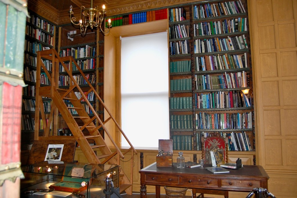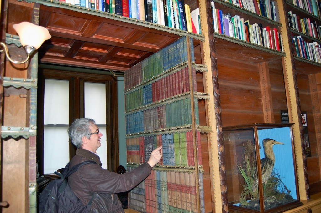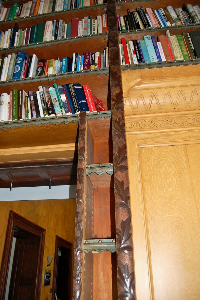 “While the library was used mostly for recreation and study, the room was also where tenant farmers paid their quarterly rents to their landlord, the Fitzgerald family. The agent, seated facing the glass doors where the tenants entered, would note the payment in his rent book and issue the tenant with a receipt. It is said that the landlord sometimes sat behind the concealed door to hear what the tenants had to say without being observed.“