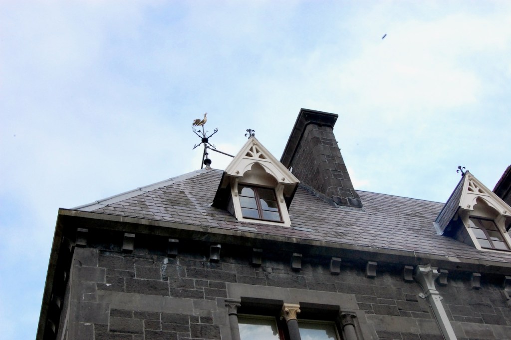 Archiseek describes it: “Dominick Andrew Browne built the present Breaffy House in 1890. The house is a Scottish baronial mansion and is victorian in style and was designed by English architect William M. Fawcett from Cambridge. The house has boldly recessed facades, a polygonal corner turret with battlements and pointed roof, a second turret set at an obtuse angle to the facade and stepped gables. The entrance front has a single story battlement porch. The building has tall slender chimneys and there are dormer windows on the roof.” (see [3])