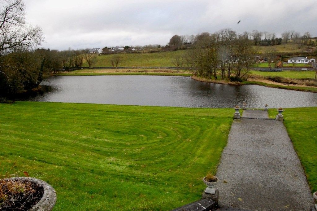 “The one-time islands Moynish, Creggaun and Leamnahaye are linked to the shore by means of the Famine Walk built between the lake and a bog area. This and the fine limestone shore edging date from famine times when the Lynchs looked after their tenants providing food and work for them. Two old cast iron pots used to cook cornmeal stand in the garden.