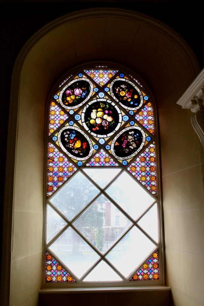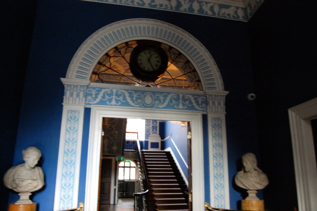 From an information panel in the entrance hall: “This room is believed to have been built to a design by the influential architect Sir William Chambers (1723-1796). Despite never visiting Ireland, Chambers left a significant mark on Dublin where he also designed the Casino at Marino, Charlemont House on Parnell Square, and much of Front Square in Trinity College. The floor and free standing Doric columns are in Portland stone. The painted glass panels featuring fruit and flowers are believed to be by the Dublin Huguenot artist Thomas Jervais (d. 1799). The marble relief busts on the walls depict well known figures from the Classical and Renaissance past, including the Egyptian queen Cleopatra and Italian poet Dante. These sculptures seem to have been acquired in Italy and would have been incorporated into the design of the Entrance Hall to signal the taste and refinement and learning of the Loftus family. The original eighteenth century marble fireplace was replaced with a painted timber one in around 1913. It was one of several of the original fireplaces which were removed and sold when the Blackburne family left the castle in 1911.“
