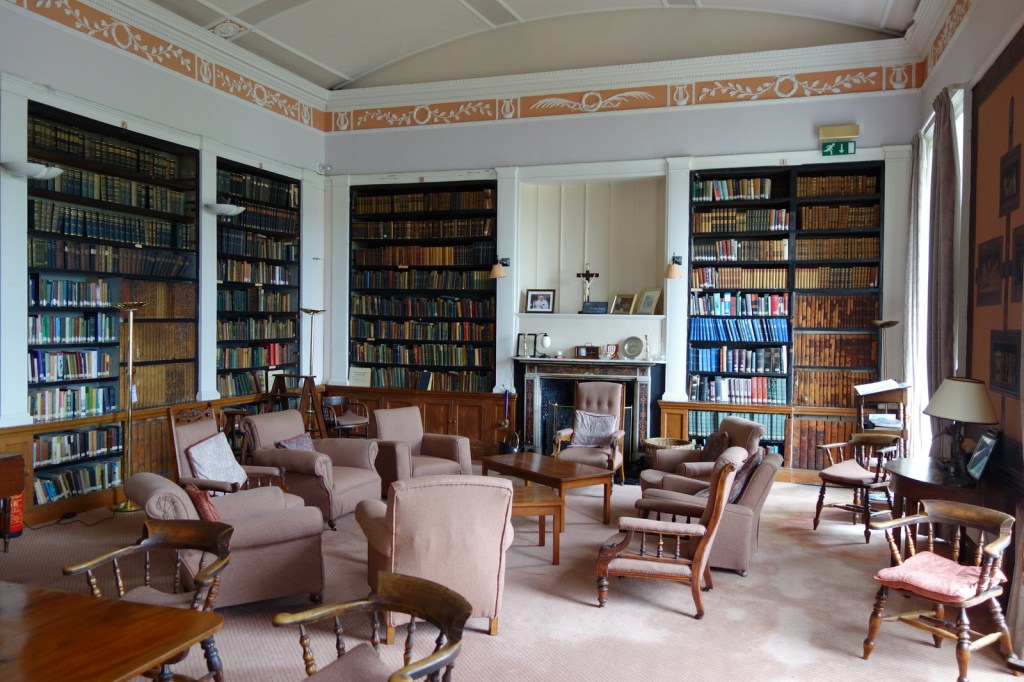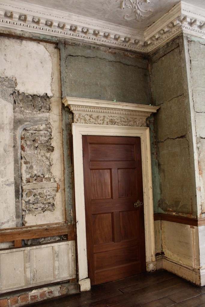 The Dining Room. “This room remains unrestored which allows us to see the changes and alternations which were made to the building over the years. The door on the left-hand (northern) wall is typically eighteenth century in style and decoration. However to the left of it a trace of the original Elizabethan doorway is visible. It was blocked up during the 18th century refurbishments. The bow extension to the eastern side of the building is another change dating to that period which added space and brought more light into these rooms. The 18th century timber wall panelling and lining paper survives in this room. It is likely that the walls were covered with silk. Although designed as a dining room, in the 20th century the Jesuits used this room as a library.“