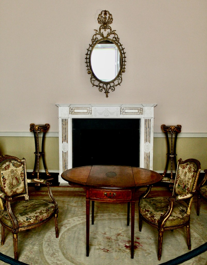 “The door immediately to the right of the stairs leads to the Apollo Room, named after the featured frieze of Apollo the music-maker holding court with attendent putti playing a variety of instruments. The adjoining Diana Room depicts Diana, patron of the chase, in a chariot drawn by stags. The design is taken directly from Pergolesi, however, Stapleton added the outer circle of flowers.