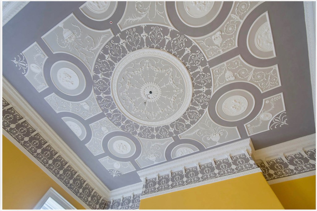 Dublin stuccodore and designer Michael Stapleton (1740-1801) was responsible for this work and further examples of his craftsmanship include the ceiling in the exam hall in Trinity College as well as some of the plasterwork in Powerscourt House in South William Street in Dublin and the Aras an Uachtarain in Phoenix Park.
