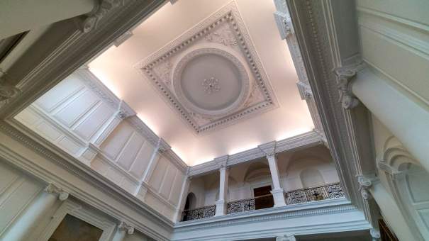 “at its centre a chamfered octagon within a square and at each end a diaper within a square, each flanked by broad figurative lunette panels at the base of the coving and bracketed by attenuated tripods, urns and arabesque finials… It remains among the finest examples of Neoclassical stuccowork in Dublin.“