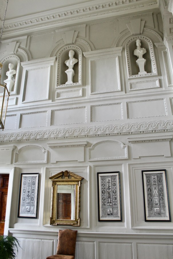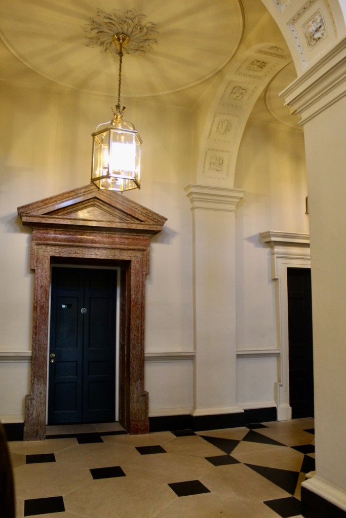 The chimneypiece in the front hall, Casey tells us, was originally faced with a pedimented niche on the north wall opposite, flanked by the doorcases. The chimneypiece is of Portland stone, she describes, with ornamental consoles and above the lintel, enormous scrolls flanking a bust pedestal.
