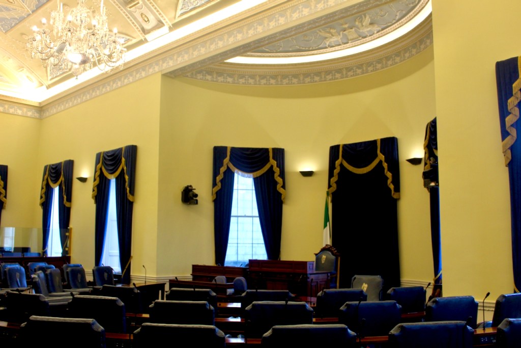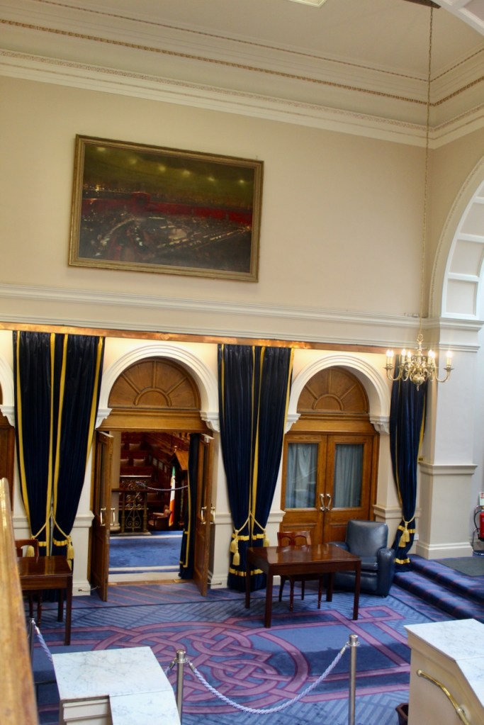 Before we go into the separate building that holds the current Dáil chamber, let us go up to the first floor. The former gallery now holds the Senate Chamber, and it fills the north end of the eighteenth century house. Both Richard Castle and Isaac Ware prepared plans for this room, but the room was unfinished when the Duke of Leinster died in 1773.
