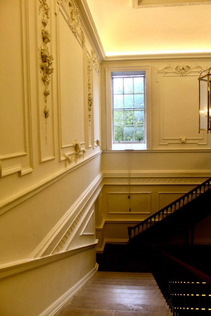 The principal stair hall is a two bay compartment north of the front hall. Casey tells us that Isaac Ware inserted an imperial staircase – one in which a central staircase rises to a landing then splits into two symmetrical flights up to the next floor – into a hall compartment which was meant for a three flight open well staircase. The staircase is further marred, Casey tells us, by a later utilitarian metal balustrade. Casey does not mention the plasterwork here, which is very pretty. The wooden staircase is a later addition.