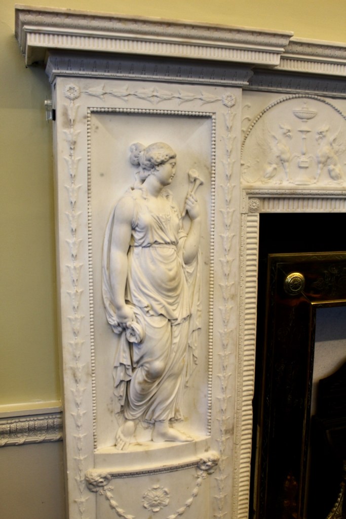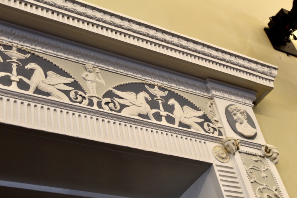 On the inner wall of the room Wyatt places three ornate double-leaf doorcases and between them two large white marble chimneypieces. The chimneypieces have high-relief female figures to the uprights and on the lintel, putti sit “between headed spandrels enclosing urns and confronted griffins.”
