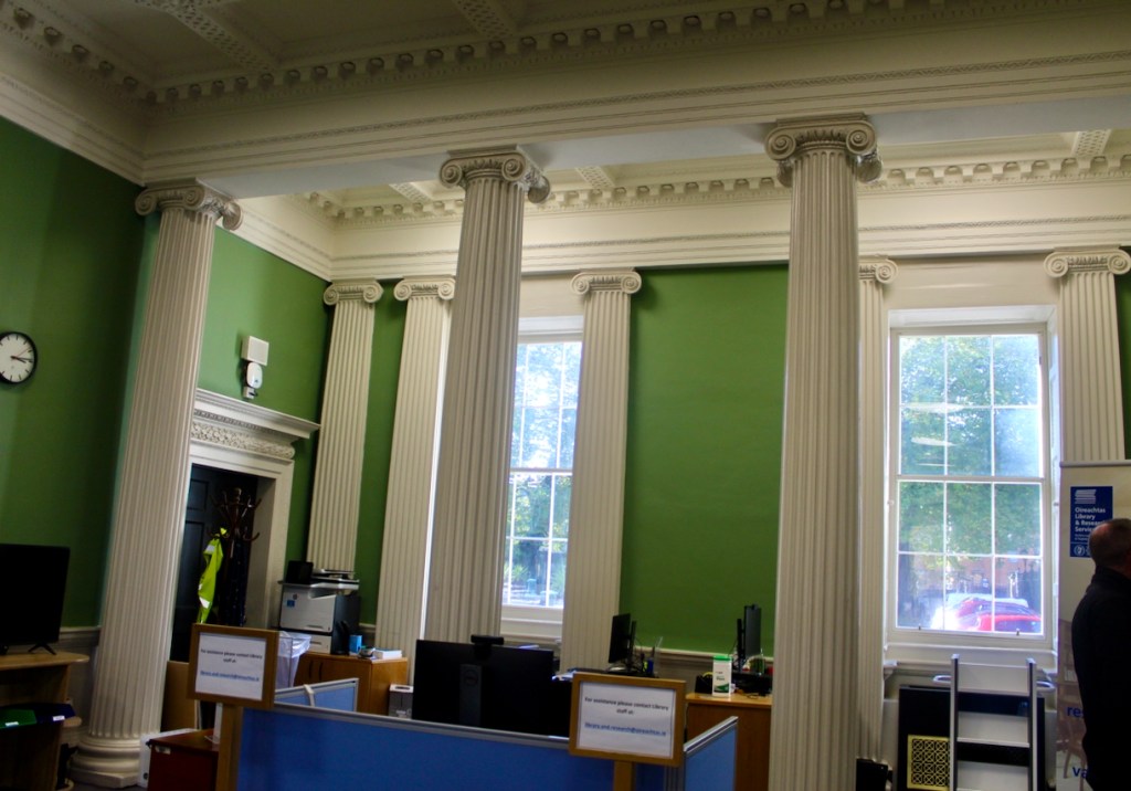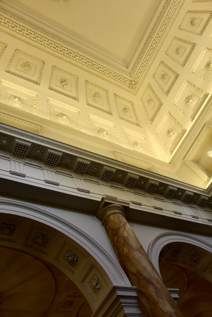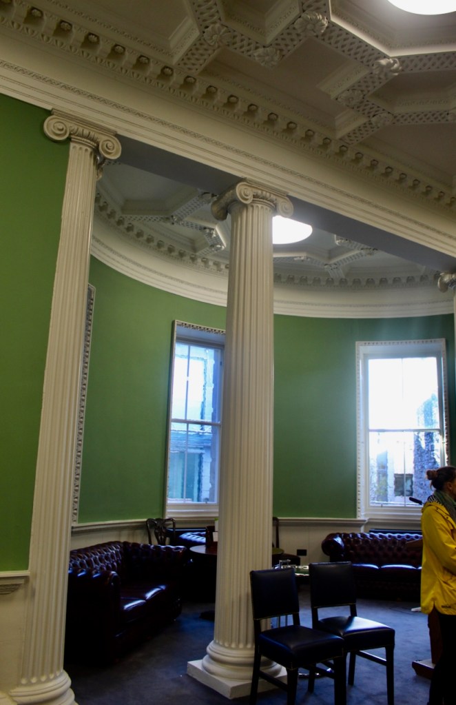Beyond the stair hall is the former Supper Room, which is now the Library of the Oireachtais, which fills the entire depth of the house. I found the lights rather offputting and think they ruin the intended effect of the room and the ceiling, which Casey tells us derives from Sebastiano Serlio (1475-1554), an Italian architect who was part of an Italian team who built the Palace of Fontainbleau, and Tutte l’opere d’architettura et prospetiva (All the Works of Architecture and Perspective) is Serlio’s practical treatise on architecture.