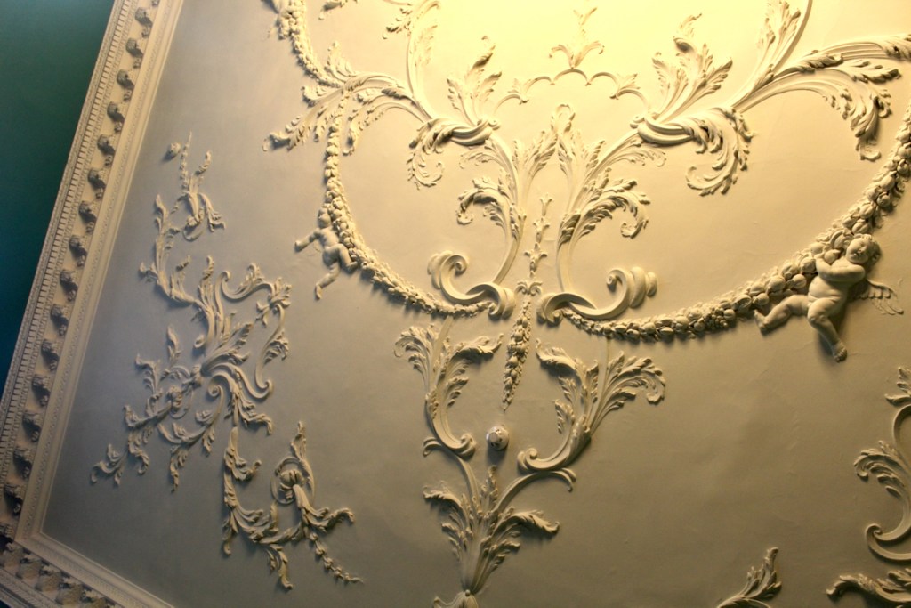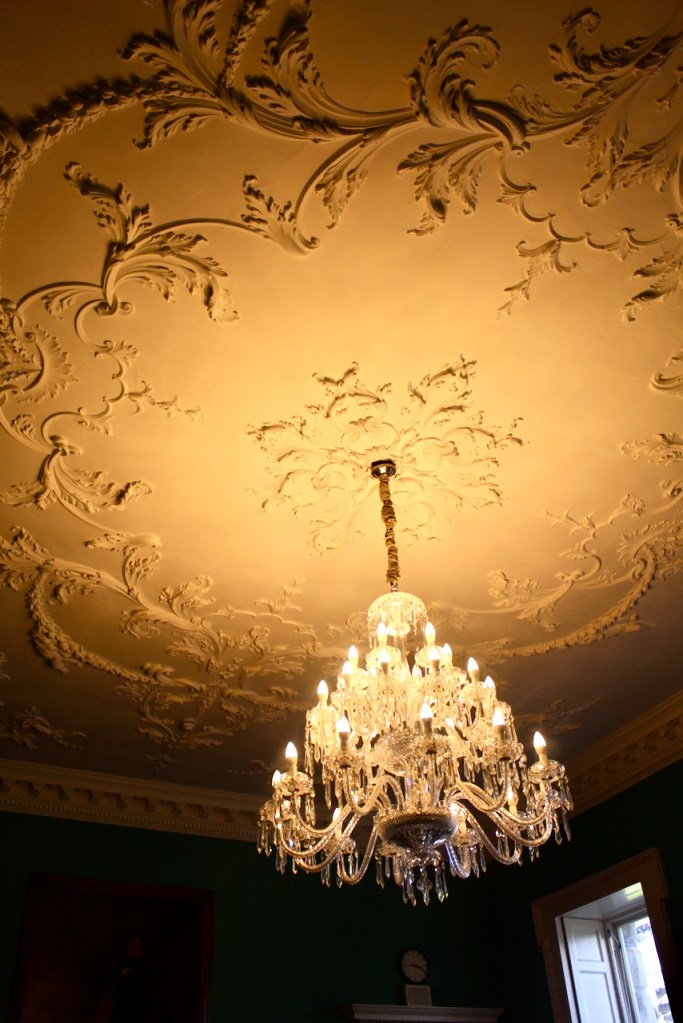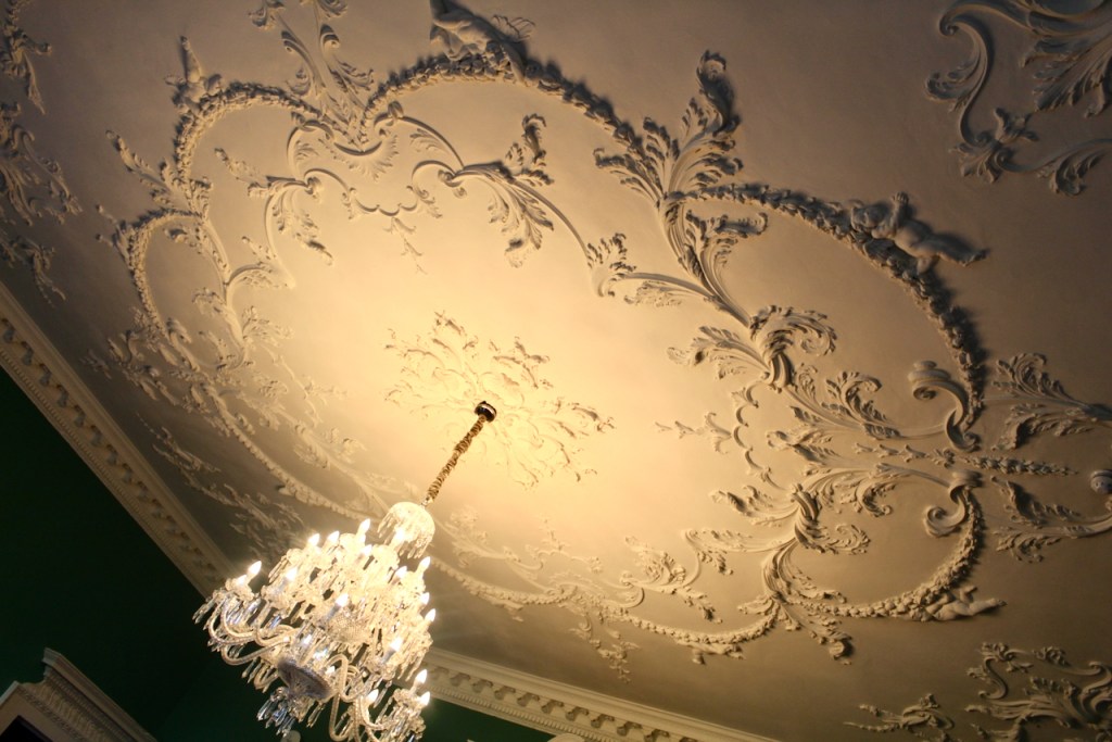 Christine Casey next describes the Garden Hall, with a more modest shell and acanthus ceiling and a chimneypiece with claw feet. Next is the former Private Dining Room, she tells us, a room from 1760, which has a ceiling with acanthus, rocaille shells and floral festoon forming a deep border to a plain chamfered central panel.