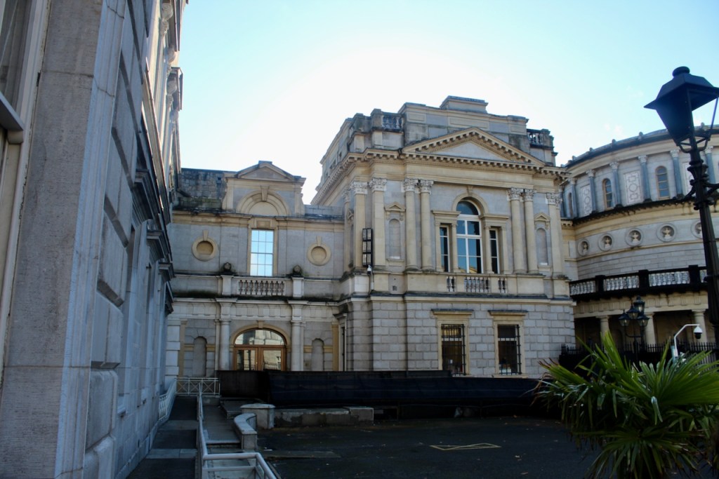 Single and paired cast iron Corinthian columns support the gallery in the former theatre. The building was appropriated as a temporary Dáil chamber in 1922 on Michael Collins’s recommendation, and in 1924 the government acquired Leinster House to be the seat of the Oireachtais. The theatre was remodelled: a new floor was inserted over the central block of seats to make a platform for the Ceann Comhairle, the clerk of the Dail, and the official reporters. The lower tier of seating was replaced with rows of mahogany and leather covered seats designed either by Hugh O’Flynn of the OPW, as the exhibition in the Irish Architectural Archive tells us, or by James Hicks & Sons according to Christine Casey, and the upper tiers became the press and public galleries. The stage was closed in and replaced by a press gallery and adjoining press rooms. The gallery was remodelled around 1930.