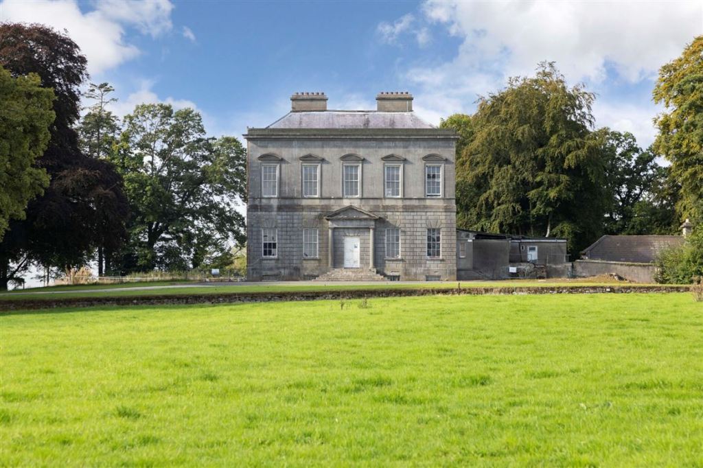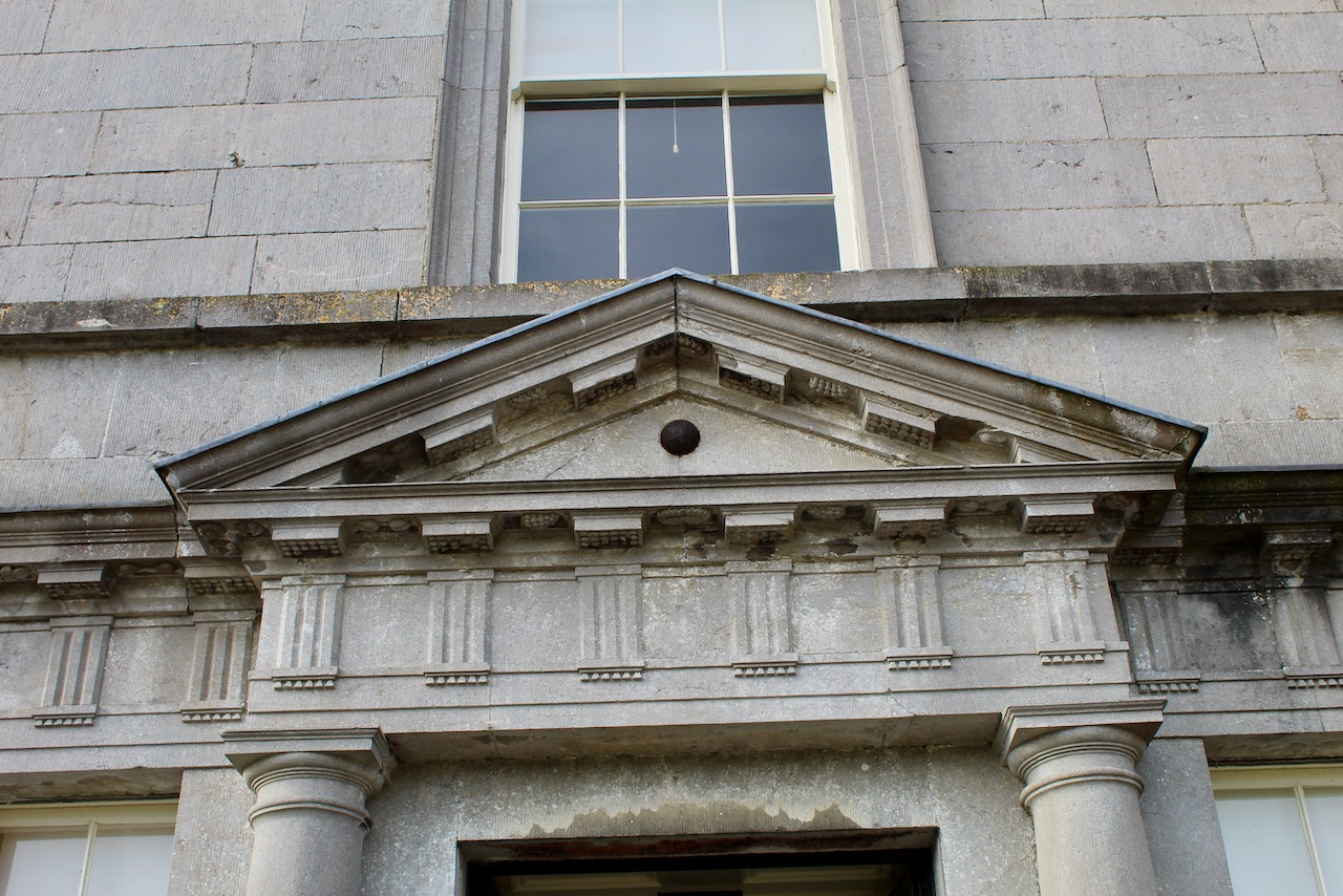 It has a centrally located tripartite doorcase with pilasters surmounted by a closed pediment, which holds a canonball from the fields of the Battle of the Boyne. It has a string course between ground and first floors and sill course to first floor, and three central windows on first floor with stone architraves. [3]