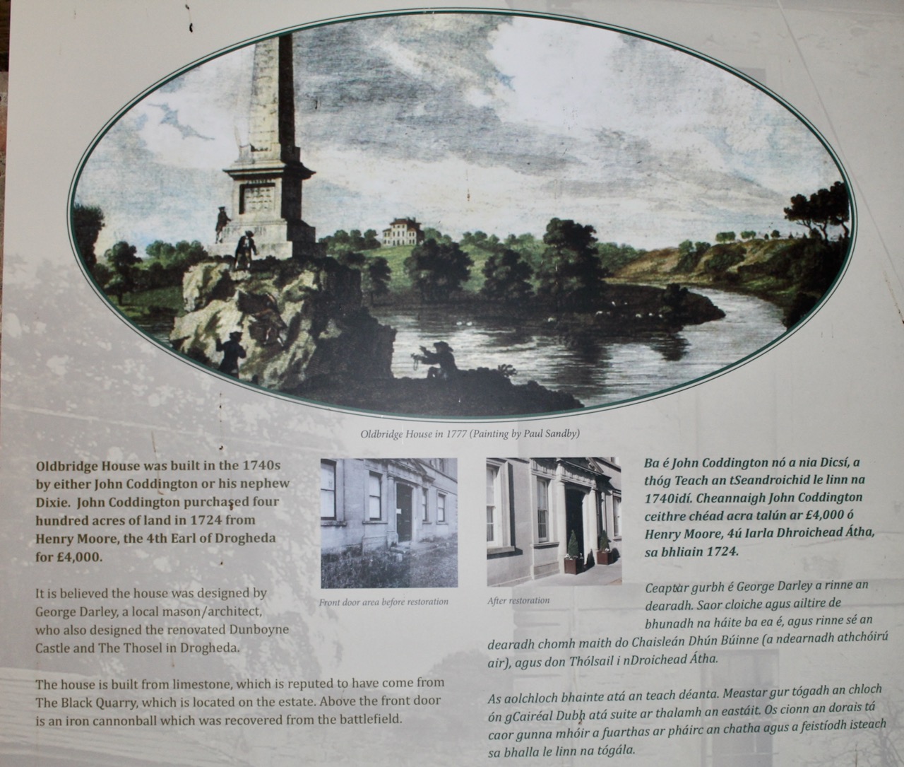 John married Frances Osbourne in 1710, and with the marriage came property in County Meath including Tankardstown. Tankardstown House is a boutique hotel and a section 482 property (see my entry https://irishhistorichouses.com/2020/07/11/tankardstown-estate-demesne-rathkenny-slane-co-meath/ ). John Coddington served as High Sheriff of County Meath in 1725, before he acquired the property at Oldbridge.