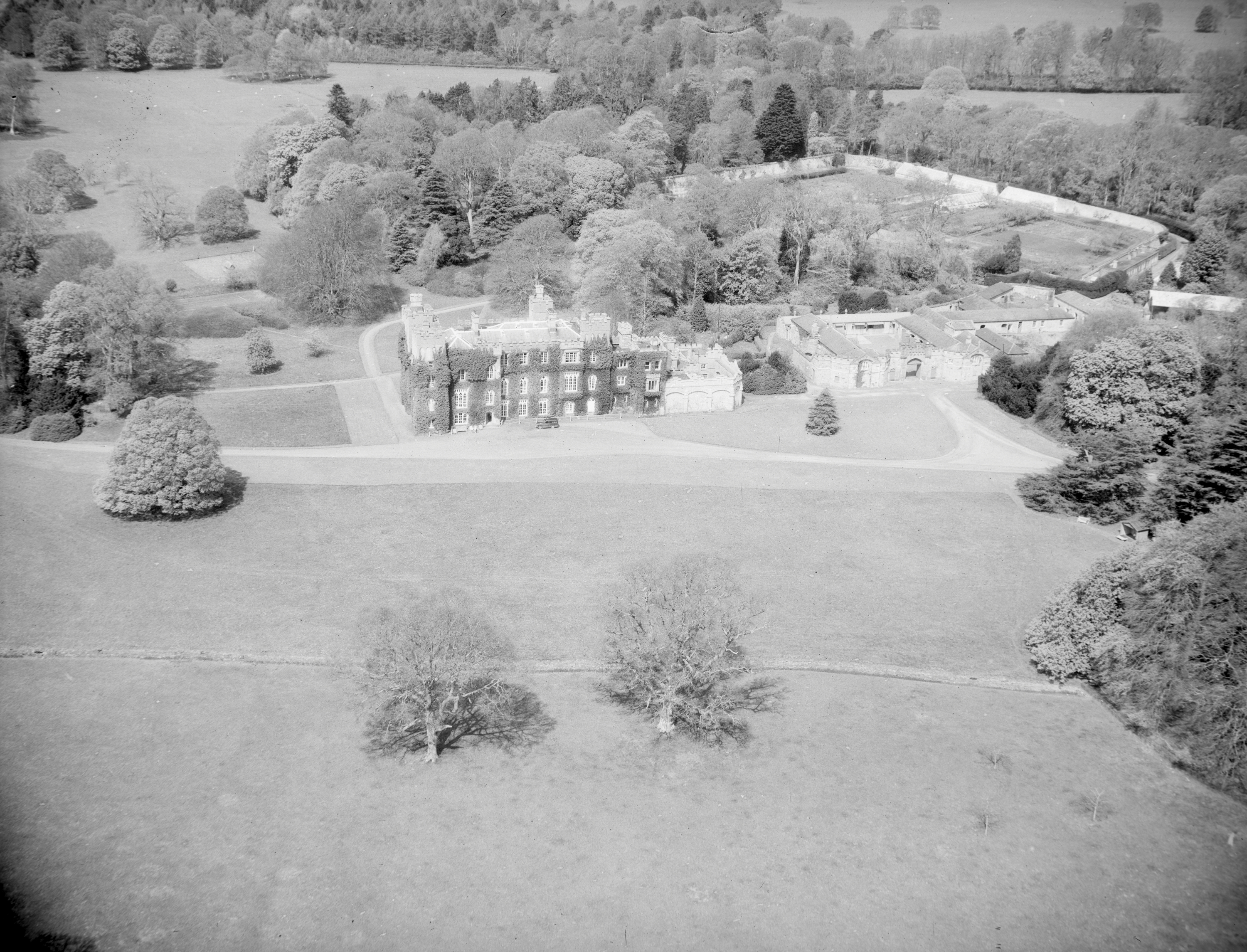 The National Inventory tells us that it was designed around 1847 by Daniel Robertson. It was built for William McClintock-Bunbury (1800-1866). Around 1953, it was truncated and reordered, to make it more liveable, and this was designed by Alan Hope.