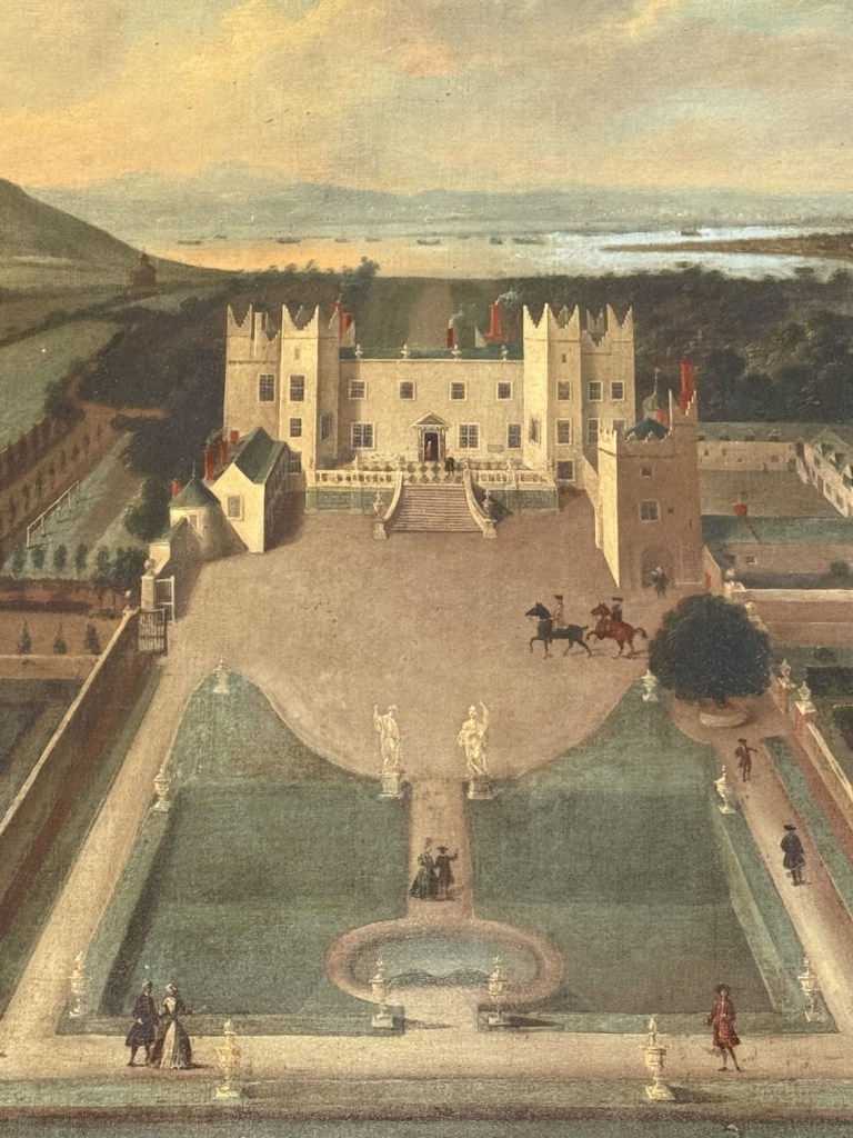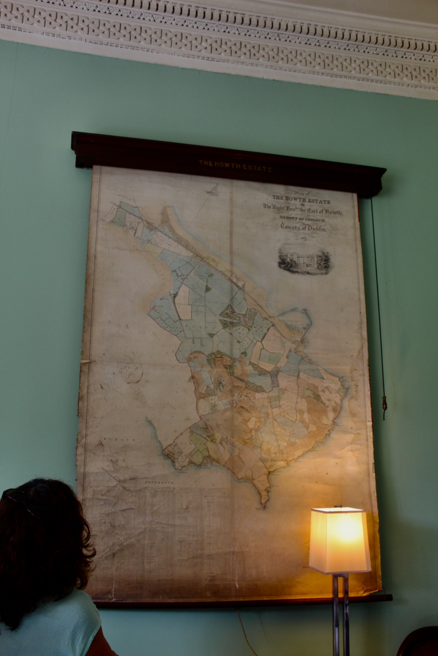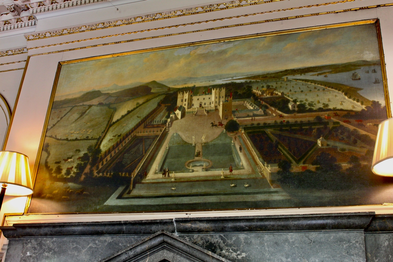 The Howth Castle website tells us that the Keep, the tower incorporated into the castle, also dates from the mid fifteenth century. Unfortunately I have misplaced the notes I took on my visit to the castle. Daniel pointed out the various parts of the castle as we stood on the balustrade looking out into the courtyard, telling us when each part was built. From the photograph of the painting above, the Keep is the large tower on the left of the front door, and the Gate House is slightly to the front of the building to the right. Traces remain in the gardens of the wall and turrets, which would have enclosed the area. You can’t fully see the keep from the front of the house.